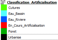 Une classification supervisée a été générée à partir de l’image initiale par une fonction de traitement du logiciel de télédétection TerreImage,. En prenant pour base des zones de test  sur le terrain, il a été possible de déterminer  6 classes d’occupation des sols. L’analyse de la classe en rouge « en cours d’artificialisation » permet de quantifier les processus d’artificialisation des sols à l’œuvre à Dongguan.