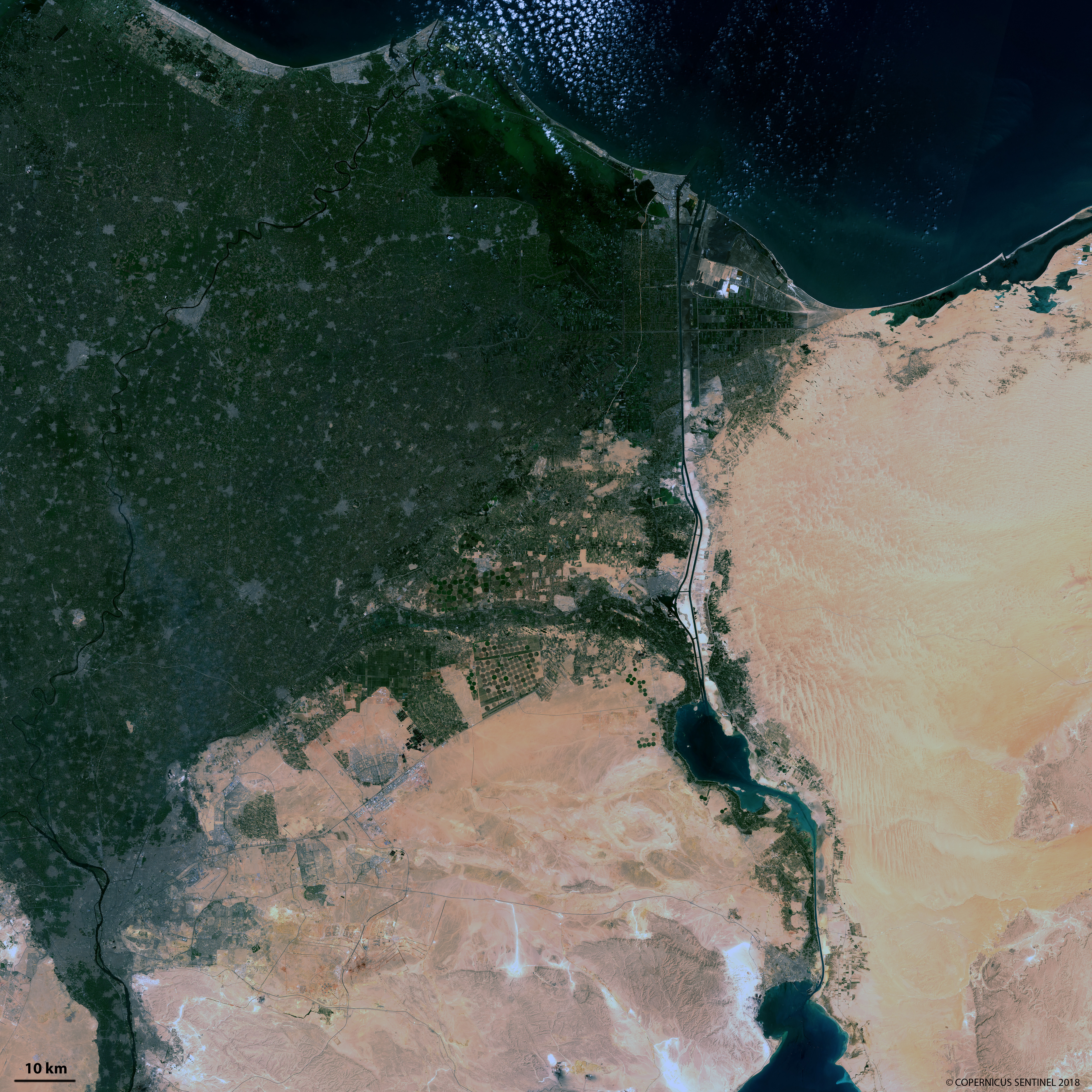 Cette image du canal de Sueza été prise le 18 avril 2018 par un satellite Sentinel-2. Il s’agit d’une image en couleurs naturelles de résolution native à 10m.