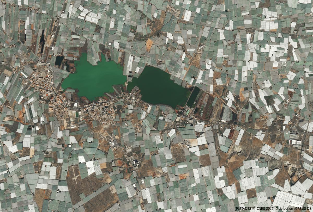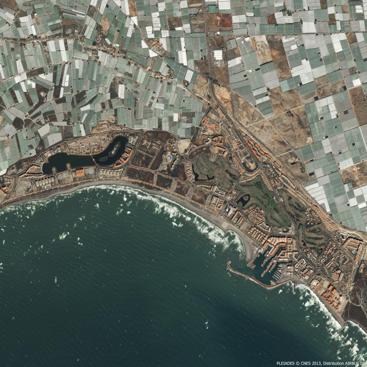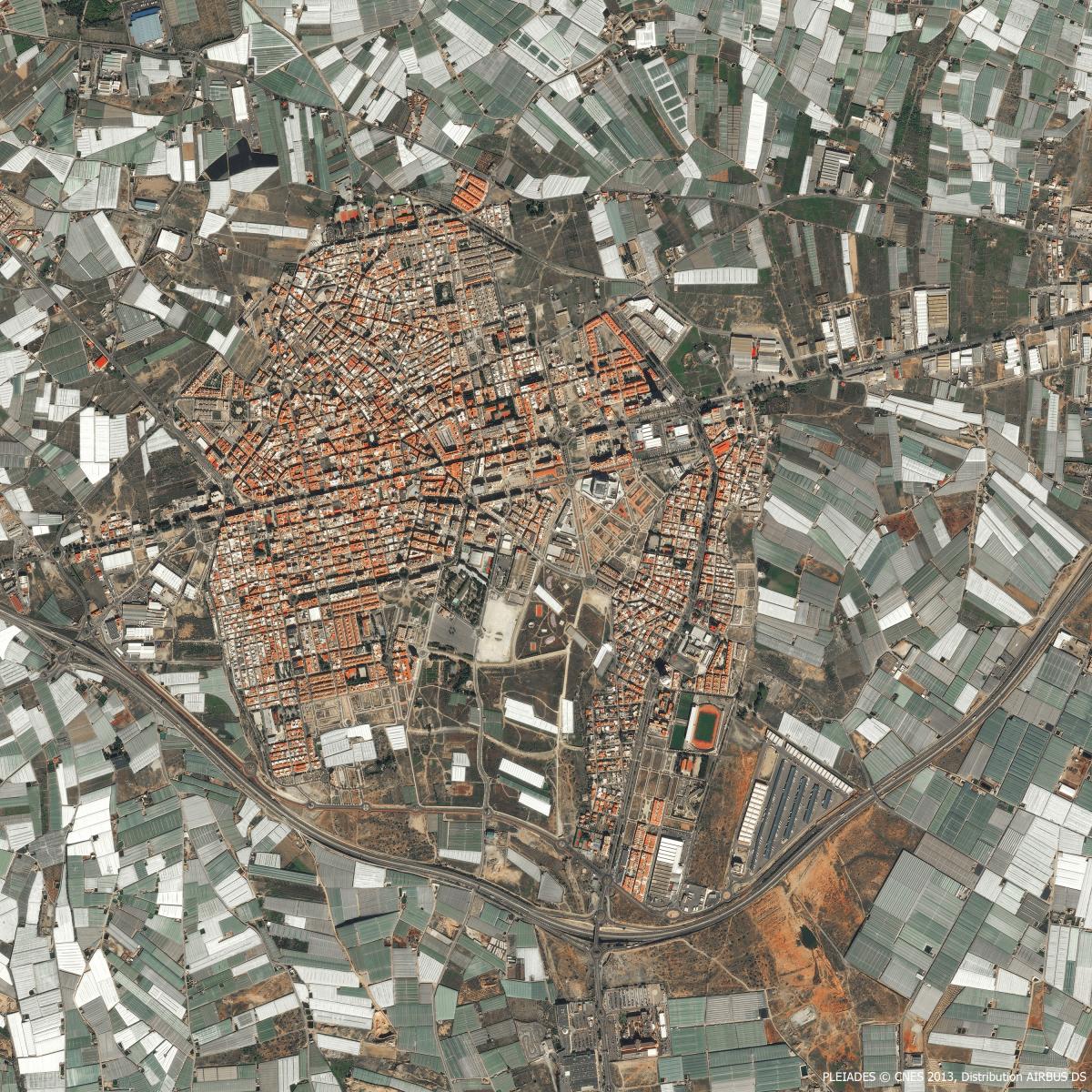 Esta imagen presenta el Campo de Dalias y fue sacada por un satélite Pléyades el 10/02/2013. Se trata de una imagen en colores naturales, de resolución nativa a 0,70 m, calibrado a 0,5 m. Nos encontramos aquí en el sur de España, en la Comunidad autónoma de Andalucía y en la provincia de Almería. El Campo de Dalias pertenece a la Costa de Almería que se sitúa entre Almería, la pequeña capital regional a 15 km al este (fuera de la imagen), y la pequeña ciudad de Adra al oeste (fuera de la imagen).