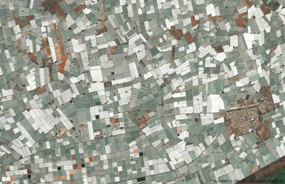 Entre el 80% y el 95% de la superficie agrícola útil (SAU) está cubierta con telas de plástico o con invernaderos, un fenómeno único en el mundo. La calidad del material, la orientación geográfica de los invernaderos y sus funciones o especializaciones explican los distintos colores. Todo esto evidencia un tablero de parcelas con orientaciones o repartos a veces diferentes que pueden informar sobre las precedentes transacciones de tierras. Al sur del zoom y al oeste de San Agustín, un extenso parcelario de pequeños cuadrados muy regulares es muestra de las huellas de una gran operación de ordenación.