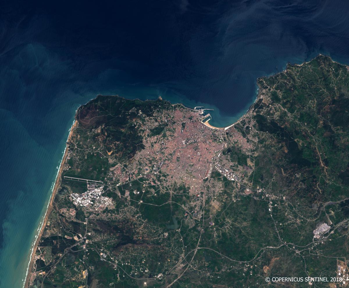 La imagen cubre la ciudad de Tánger y su larga área metropolitana al suroeste del estrecho de Gibraltar. Se despliega sobre un sitio excepcional : una extensa rada orientada al norte y bastante bien abrigada entre litoral rocoso al este y litoral de playas de arena del lado atlántico. Antiguo emporio fenicio y después capital provincial de la Mauritania tingitania (con capital en Tingis), la ciudad fue el objeto de numerosas codicias a lo largo de los siglos. A finales del siglo XIX, esta puerta abierta sobre Marruecos fue el objeto de fuertísimas rivalidades en particular entre Francia y el Segundo Imperio Alemán.
