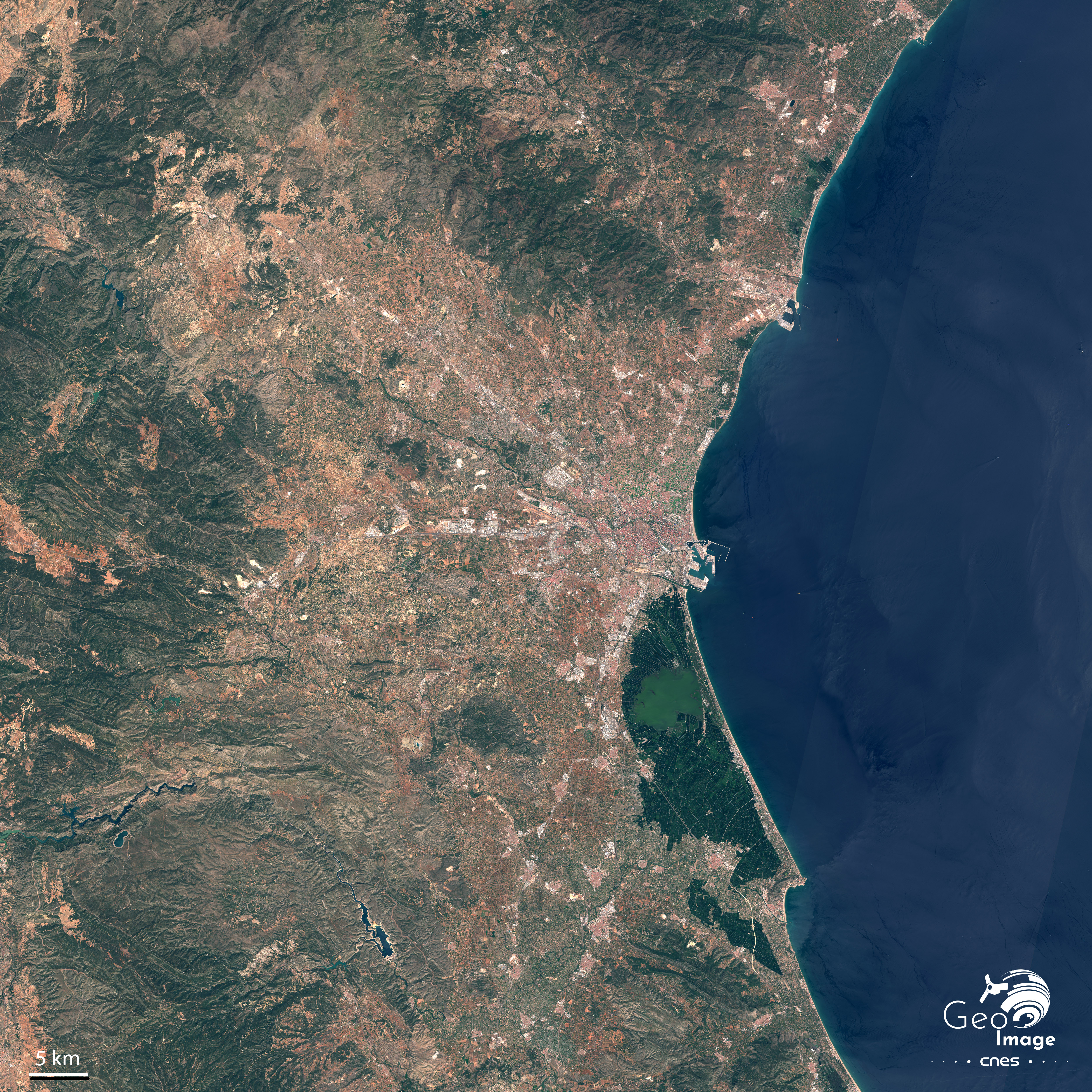 Cette image couvre le cœur de la Région valencienne (Communidad del Pais Valencia) qui se trouve au centre du littoral méditéranéen de l’Espagne, entre la Catalogne au nord et la Murcie au sud. Nous sommes là dans la province centrale de la troisième Communauté espagnole pour la population et l’économie, après Madrid et Barcelone. Cet espace illustre largement les mutations géographiques intervenues en Espagne en general, et à Valence en particulier, depuis la seconde moitié du XXème siècle : transformation des bases économiques et développement, métropolisation et littoralisation.