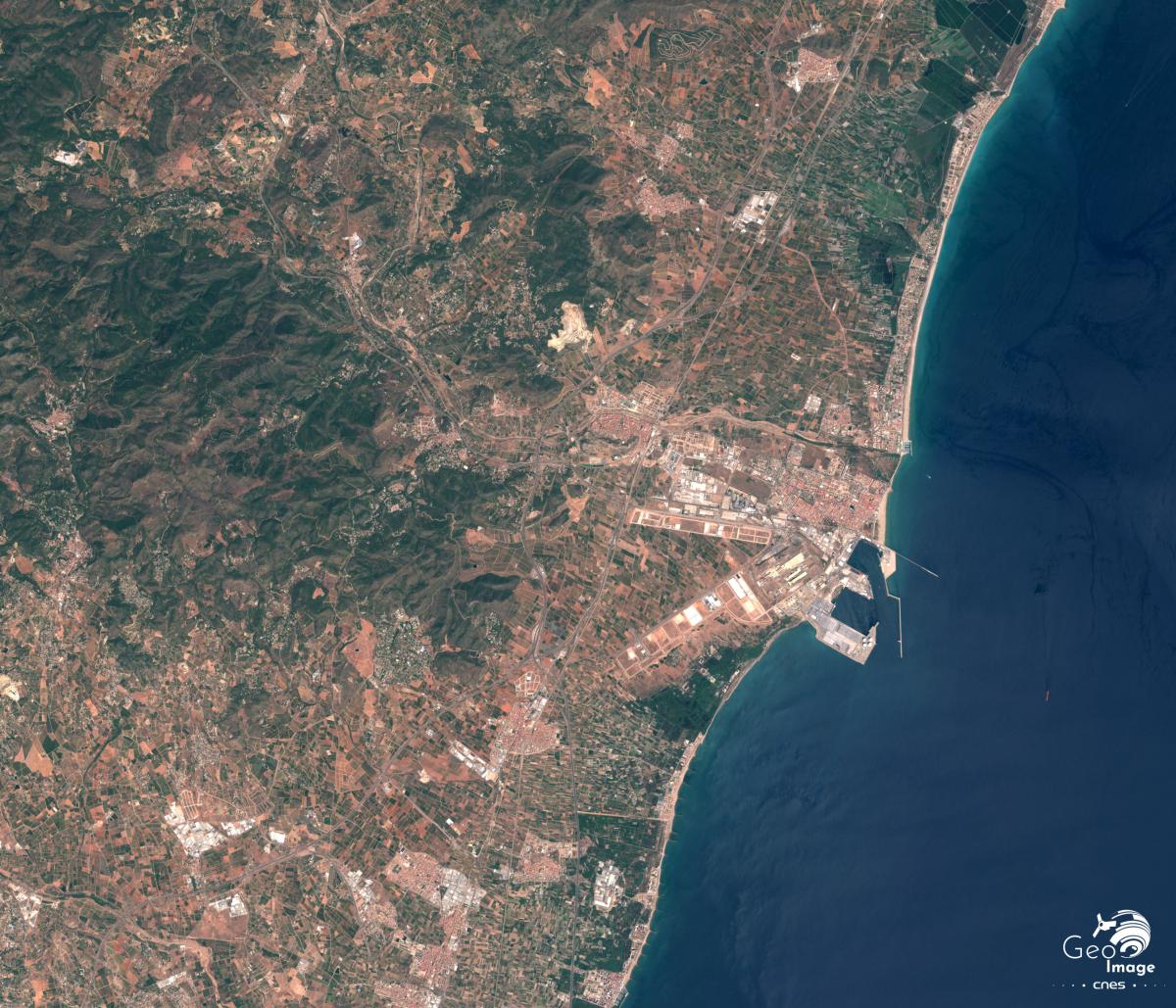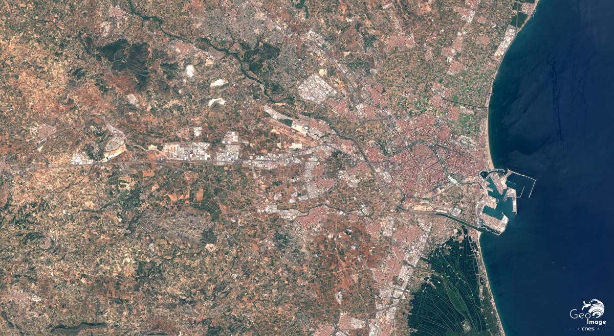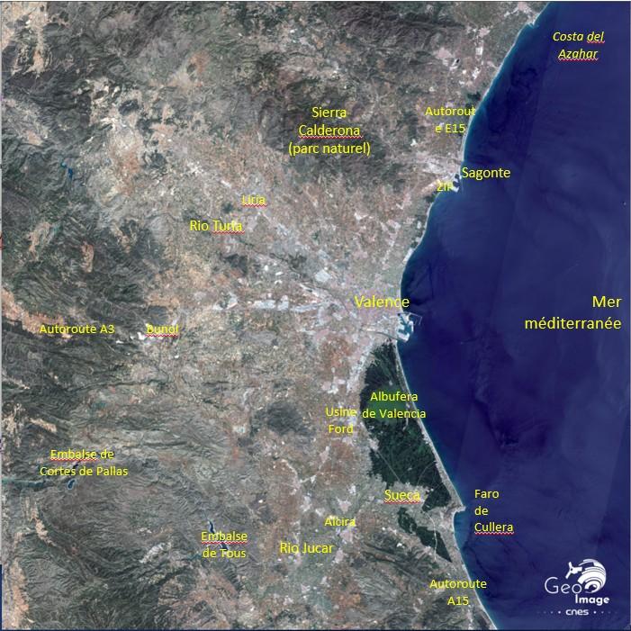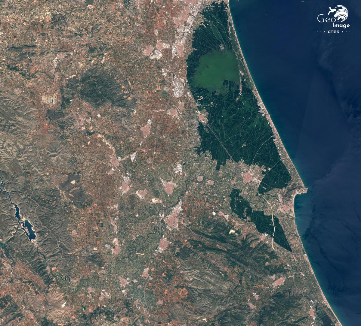 Esta imagen cubre el corazón de la Comunidad Valenciana ubicada en el centro de la costa mediterránea de España, entre Cataluña al norte y Murcia al sur. Estamos aquí en la provincia central de la Tercera Comunidad Española en lo que respecta a la población y la economía, después de Madrid y Barcelona. Este espacio ilustra en gran parte los cambios geográficos que han tenido lugar en España en general, y en Valencia en particular, desde la segunda mitad del siglo XX : transformación de bases económicas y desarrollo, metropolización y litoralización.
