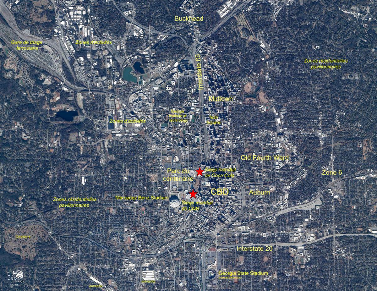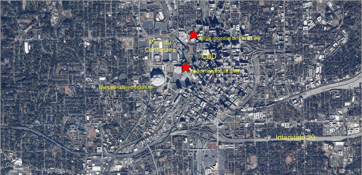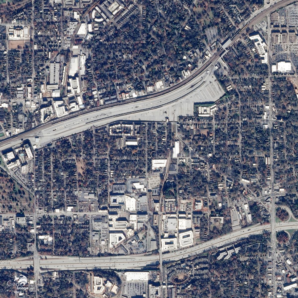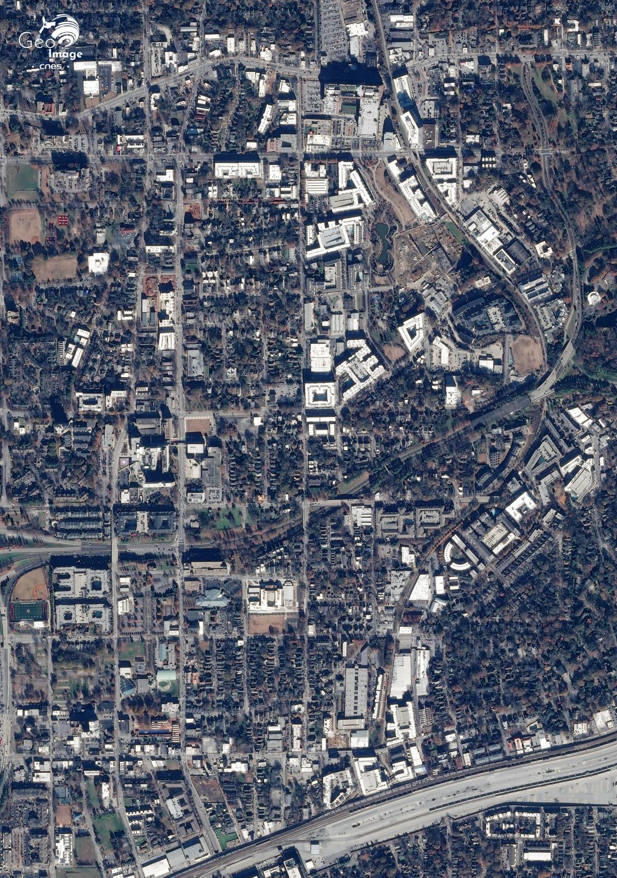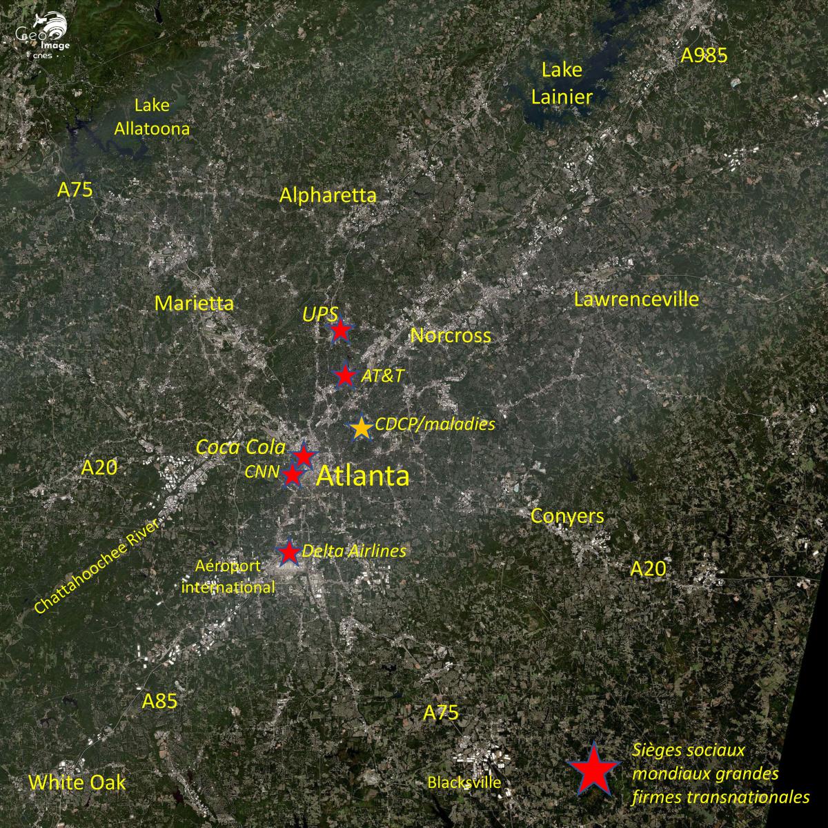 Sur la vue Sentinel-2 à l’emprise plus large (cf. image centrale) on assiste le long des axes à des pôles de développement urbain le long des axes de communication. A 11 kilomètres à l'Ouest de la ville, un autre aéroport le Fulton country airoport est visible au croisement de l'Interstate 20 et de la rivière Chattahoochee. A ce même croisement on peut également observer un parc d'attractions le Six Flags. Ce pôle est complété par de nombreux entrepôts de zones industrielles.*