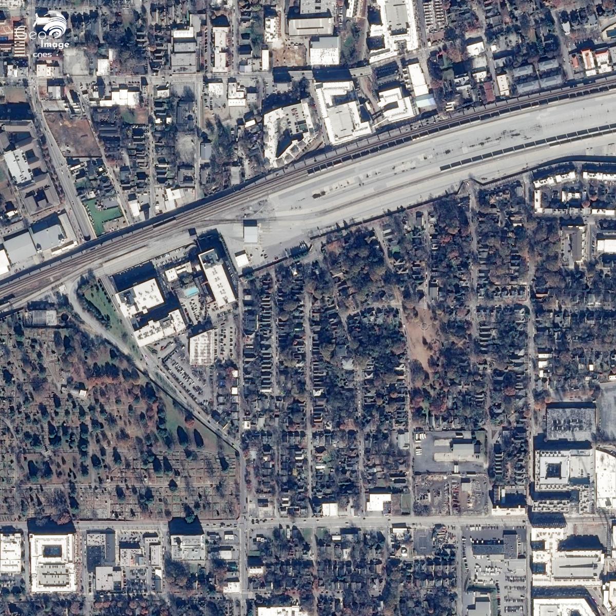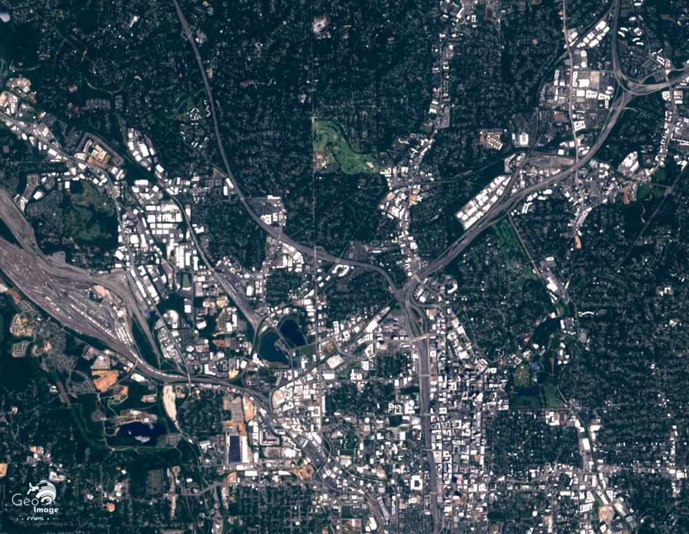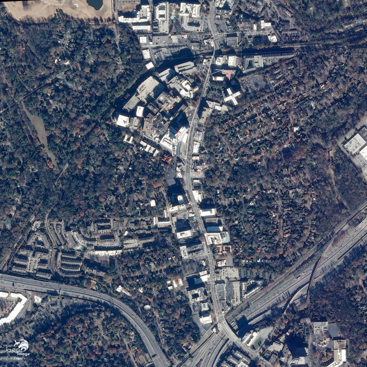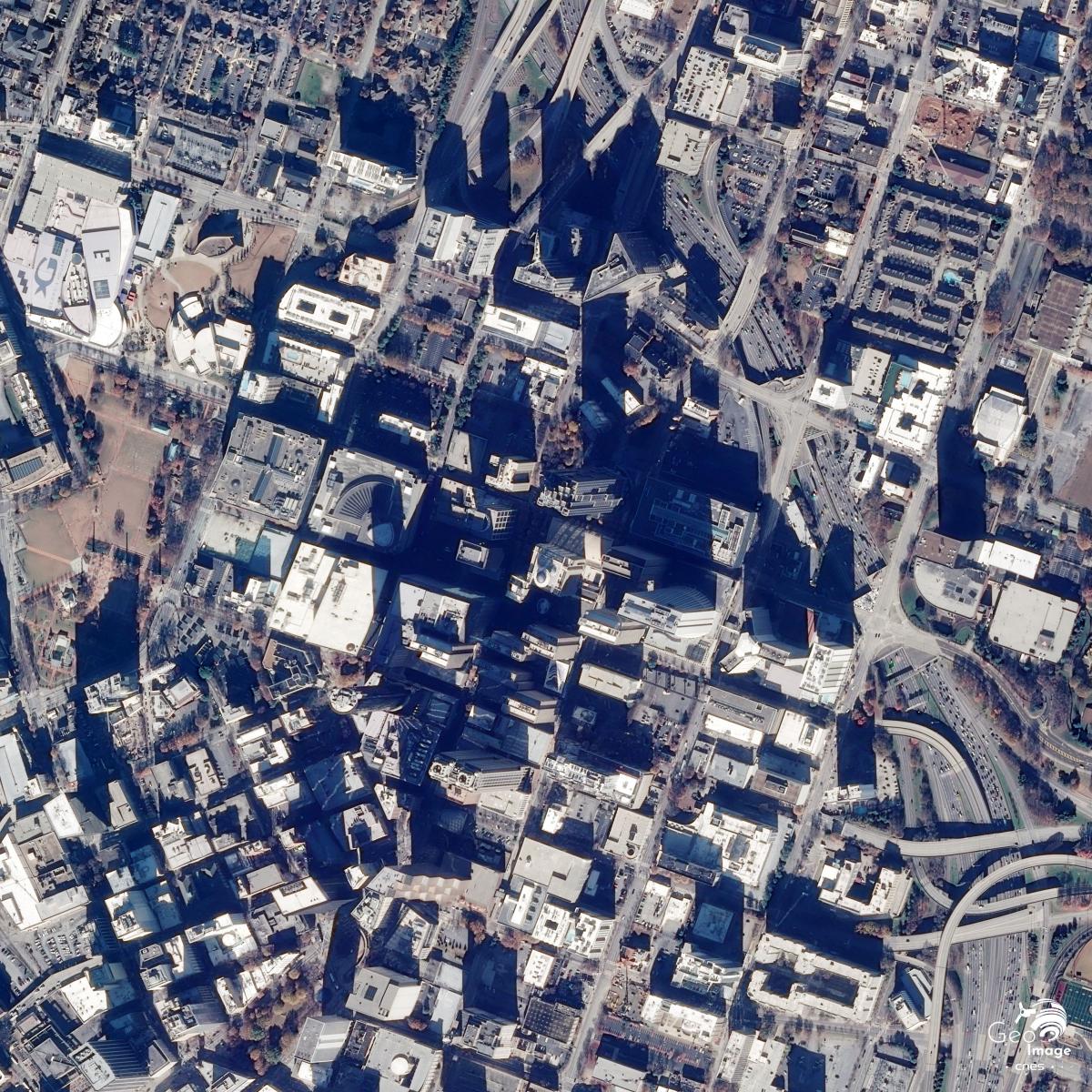 Sur la vue Sentinel-2 à l’emprise plus large (cf. image centrale) on assiste le long des axes à des pôles de développement urbain le long des axes de communication. A 11 kilomètres à l'Ouest de la ville, un autre aéroport le Fulton country airoport est visible au croisement de l'Interstate 20 et de la rivière Chattahoochee. A ce même croisement on peut également observer un parc d'attractions le Six Flags. Ce pôle est complété par de nombreux entrepôts de zones industrielles.*