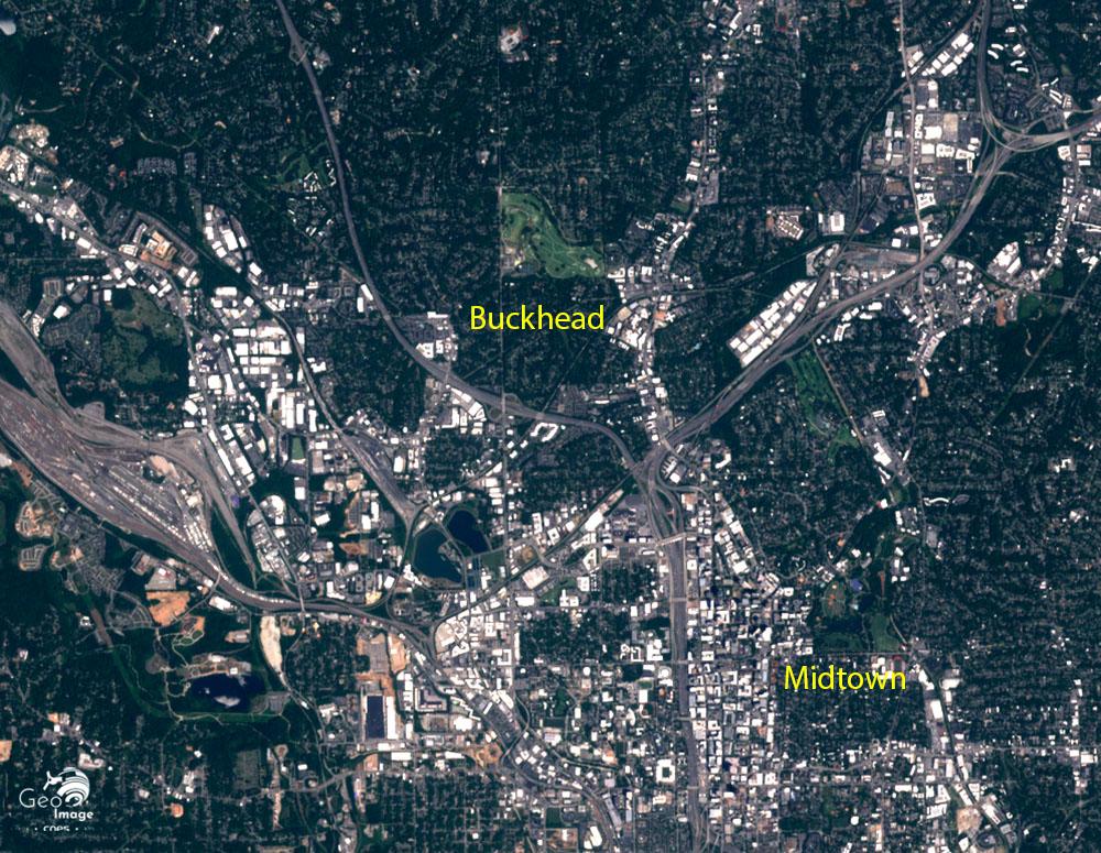 C'est encore l'Interstate 85 qui joue le rôle de frontière, délimitant au sud le quartier de Buckhead, historiquement centré sur les collines des Atlanta Heights et qui a connu un développement important, en marge de ceux de Downtown et Midtown. Illustration du cloisonnement socio-spatial, Buckhead concentre une population aisée, des espaces verts et des centres-commerciaux dédiés à une population à fort pouvoir d'achat. L'interaction de plusieurs phénomènes – concentration de populations aisées, faible densité du bâti, construction de mall – a conduit à une certaine déconnexion entre Buckhead et son environnement urbain direct.