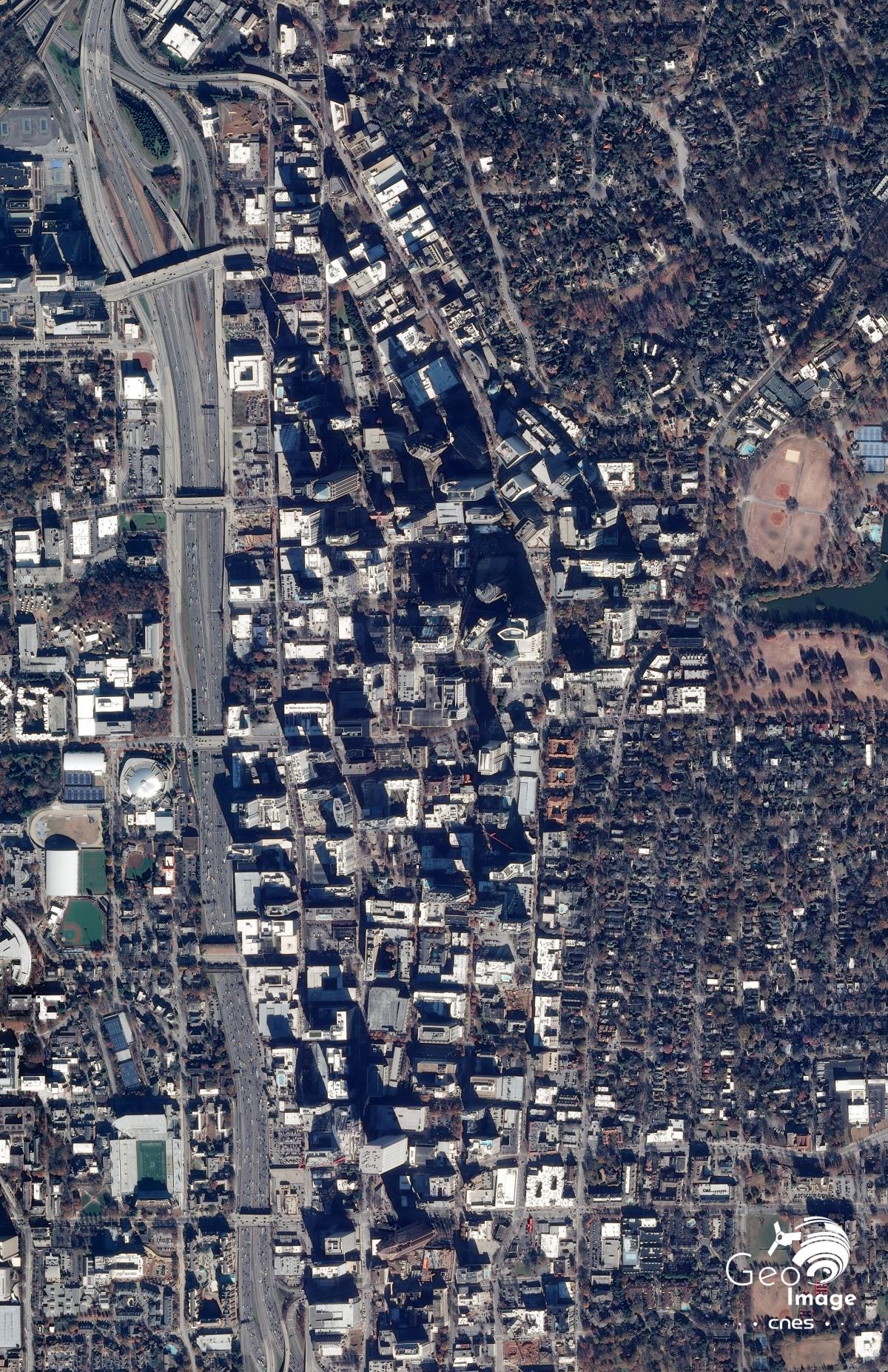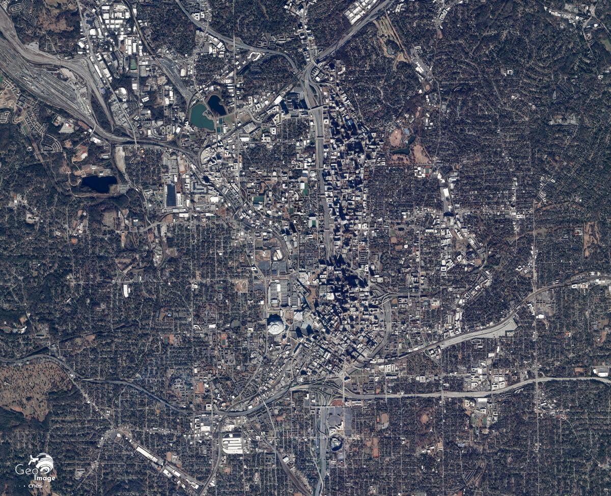 Nous sommes ici tout au sud des Appalaches, sur la zone de contact entre le massif montagneux, le piémont des Blue Ridge et la plaine côtière. Atlanta, située à 320 mètres d'altitude domine le seuil, et donc le carrefour, entre le bassin du Mississippi à l’ouest et la côte Atlantique à l’est. Le climat subtropical humide de la Géorgie est légèrement dégradé par l'altitude de la ville. Il produit néanmoins une végétation assez dense, observable sur l'image, grâce à une température moyenne de 17 degrés C° sur l'année.