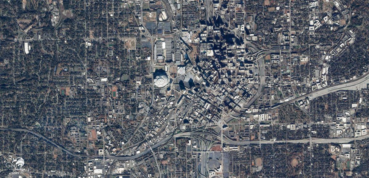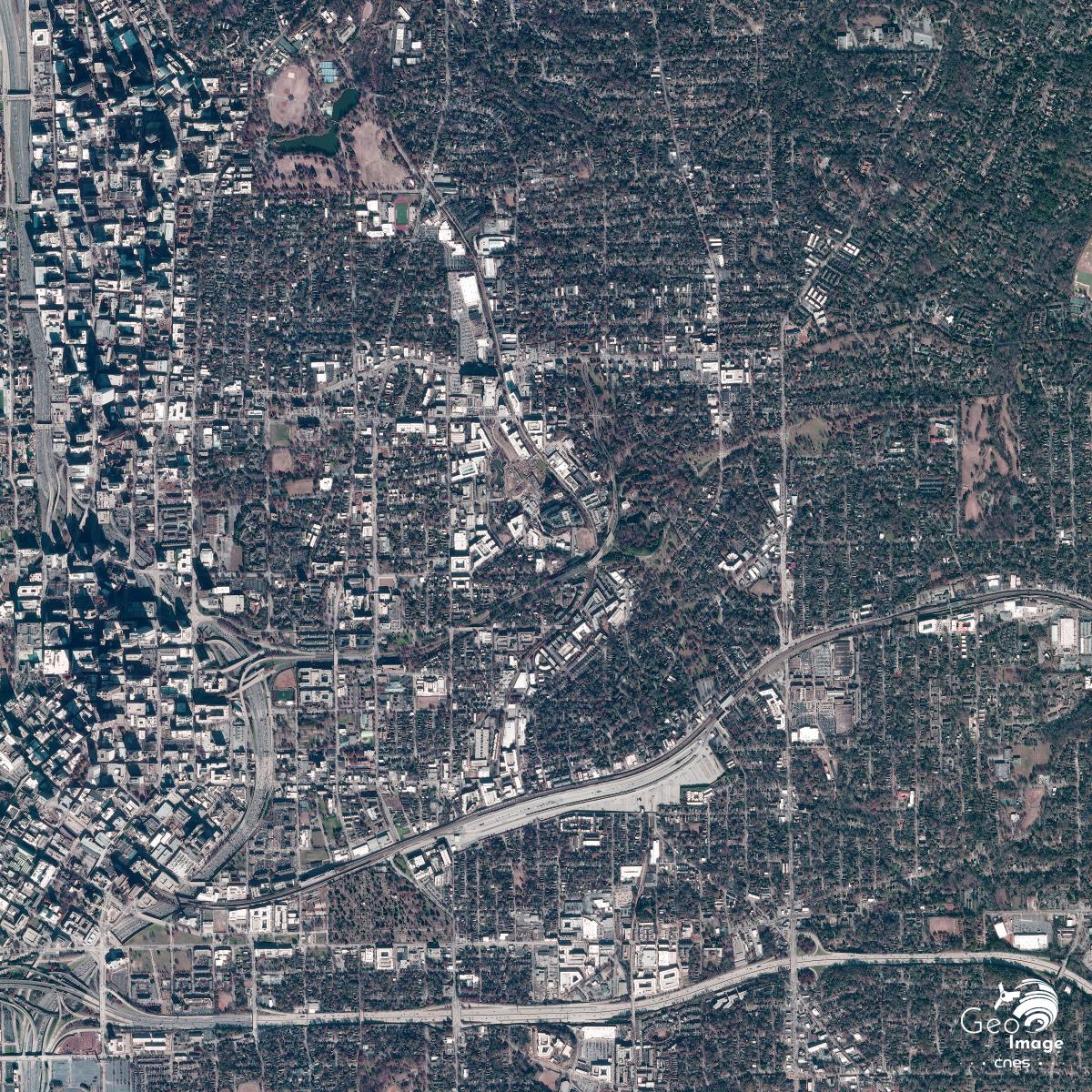 L’expansion de la ville s’est d’abord faite vers le nord, où l’on trouve les quartiers les plus denses, Midtown ou Buckhead, avant de se développer le long des axes autoroutiers structurants, les Interstate 20 et 85, vers le sud, l’ouest et surtout l’est. Ces deux axes sont clairement visibles sur l'image satellite. L'Interstate 85, d'orientation nord-sud structure la ville et ses quartiers et le métro d'Atlanta reprend son orientation. L'Interstate 20, d'axe est-ouest délimite la ville plus au sud et donne naissance à un impressionnant nœud autoroutier à sa rencontre avec l'interstate 85, bien visible au sud de la ville, qui a hérité du nom de Spaghetti jonction, comme d'autres nœuds routiers majeurs des États-Unis.