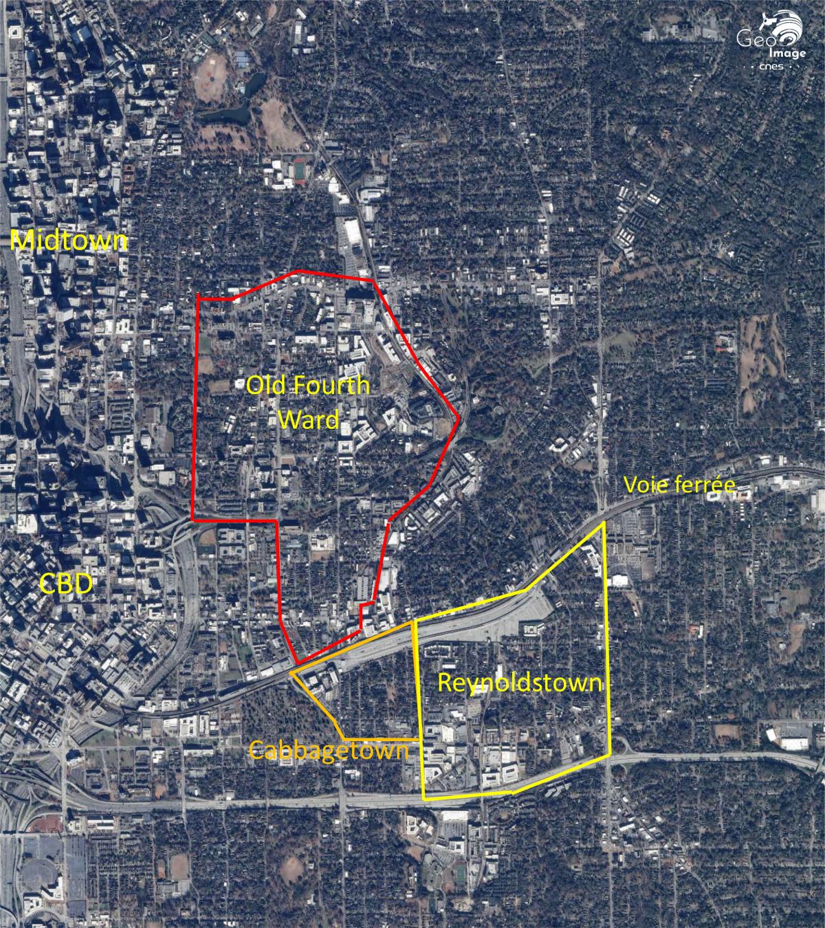 Il est intéressant de constater que ce pôle est séparé du reste de la ville par un tissu de banlieues peu denses où les programmes immobiliers peuvent être identifiés de par la structure des rues et la toponymie typique de ce type de programmes (Chalet Woods, Heritage Valley, Wisteria Gardens...). Particularité locale, l’espace est aujourd’hui structuré selon six zones délimitées par le Département de la Police d’Atlanta, organisation structurelle qui est devenue peu à peu représentative de l’urbanisme de la ville.