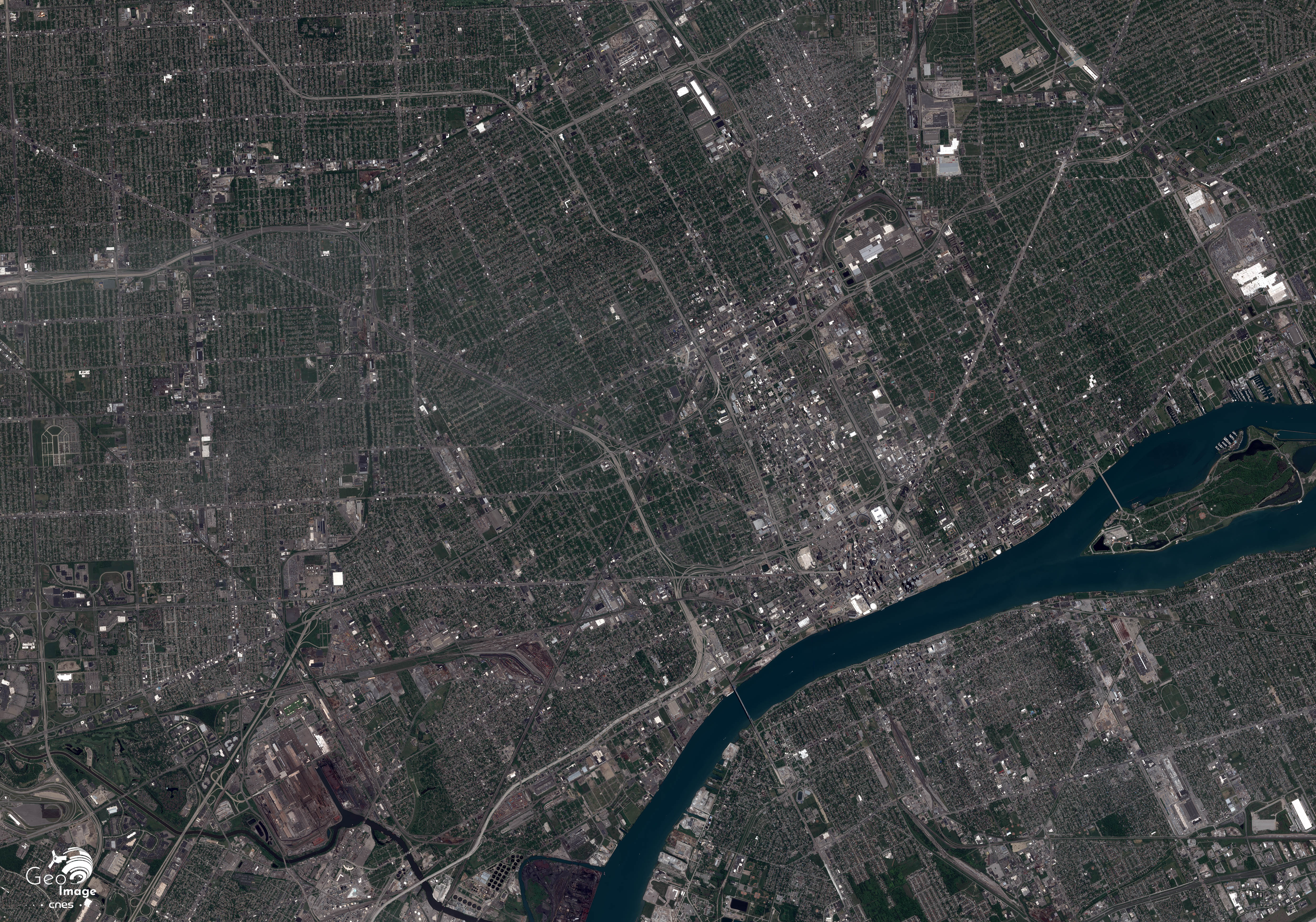 Cette image en haute définition prise par le satellite Pléiade couvre pour l’essentiel la commune de Détroit. Au nord-est se trouvent les minuscules enclaves des communes de Highland Park et d’Hamtramck, alors qu’au sud-ouest se trouvent les communes de Dearborn et River Rouge. Le dossier est complété par une image Sentinelle qui couvre l’aire métropolitaine de Détroit et son cadre régional afin de mobiliser les emboitements d’échelles pour mieux comprendre et analyser les différentes dynamiques territoriales.