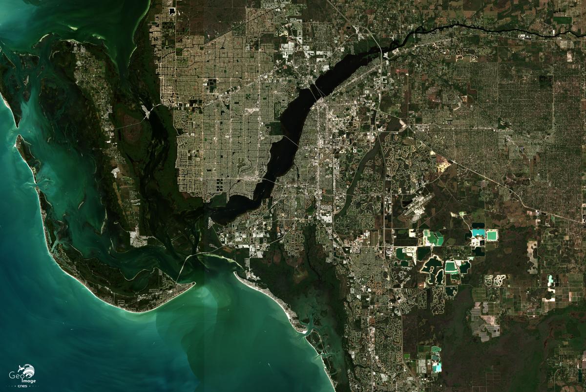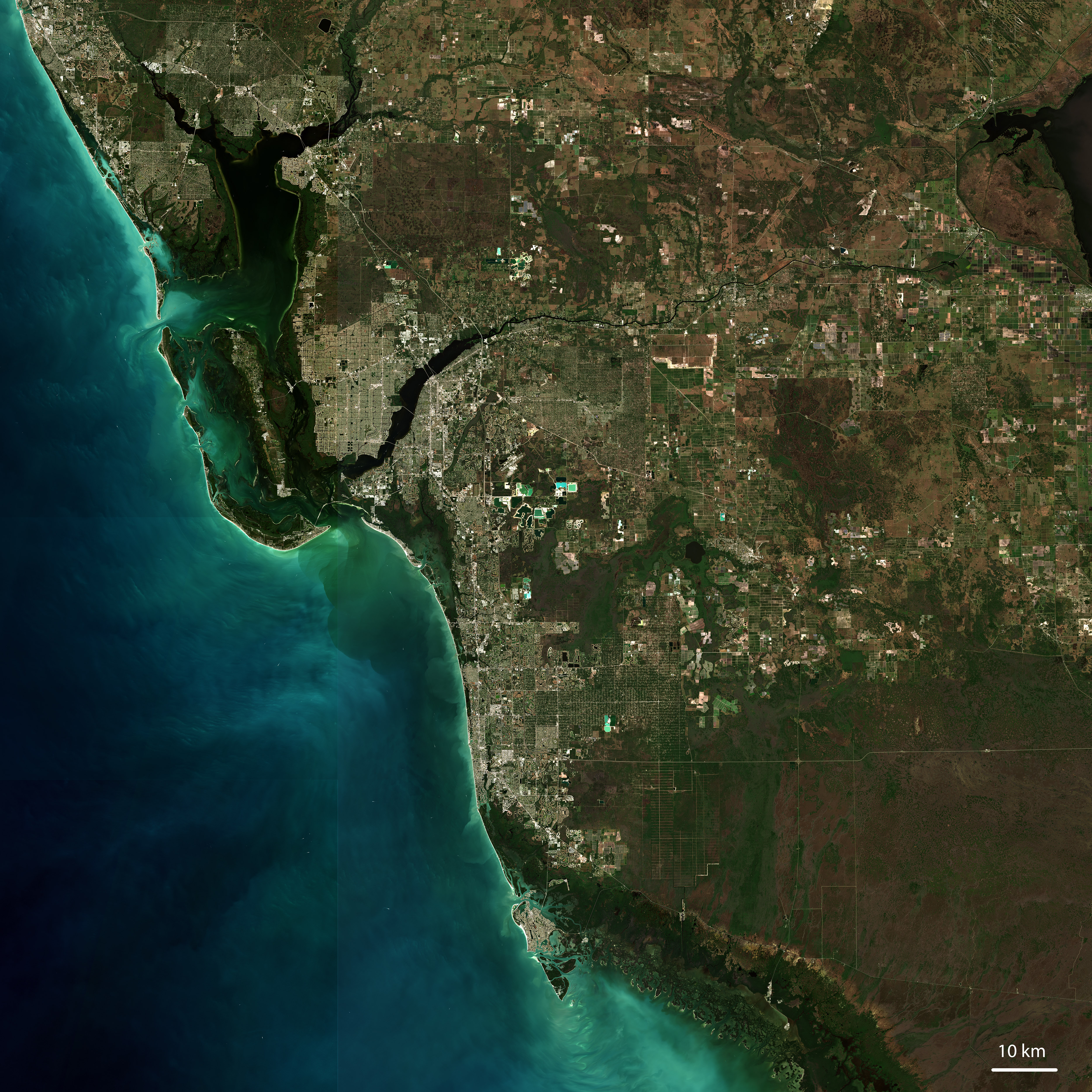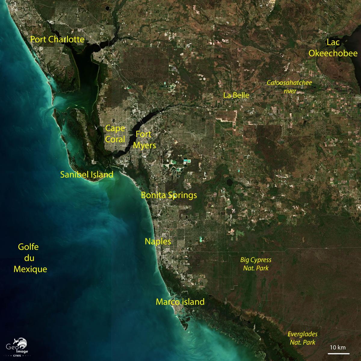 La photographie satellite couvre le littoral sud-ouest de la Floride. Bordée par le golfe du Mexique, l’image s’étend du Parc National des Everglades au sud jusqu’à Port Charlotte et l’embouchure de la Peace River au nord en direction de la métropole de Tampa - St Petersburg. Hormis le lac Okeechobee au nord-est, c’est une diagonale littorale qui s’étire sur 160 kilomètres entre Everglades City au sud et le Comté de Charlotte au Nord.