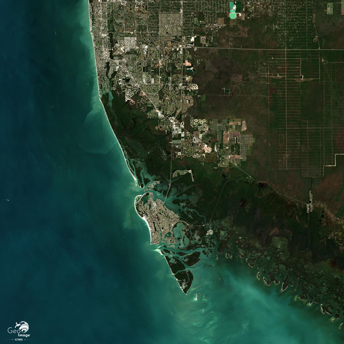 L’île de Marco Island, parfaitement visible sur l’image satellite, est entourée d’espaces protégés par des différents acteurs. Elle jouxte le parc national des Everglades, espace protégé par l’État fédéral et deux réserves gérées par l’État de Floride. L’île est uniquement accessible par deux ponts, l’un vers Naples au nord et l’autre vers le Collier - Seminole State Park à l’est. Peuplée de 16.000 habitants, c’est une enclave touristique au cœur de mangroves comme le montre la découpe du littoral au sud de la station.