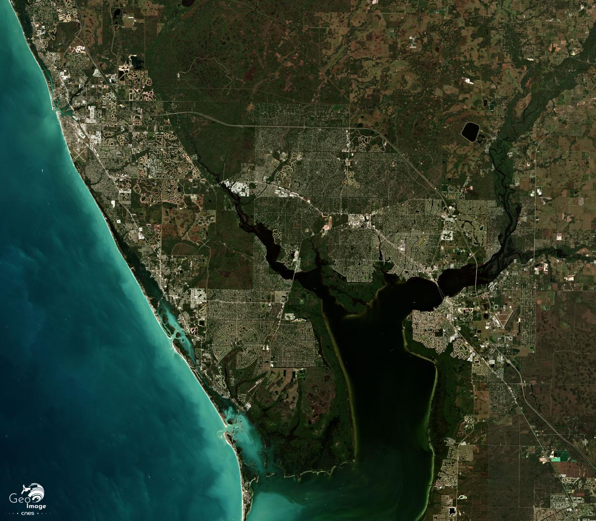 La rivière Caloosahatchee, longue de plus de 100 kilomètres, est aménagée depuis le XIXème siècle, pour permettre l’agriculture et l’irrigation. Reliée par un canal au lac Okeechobee, elle est au cœur d’une région rurale qui prolonge le vaste espace agro-industriel sucrier du centre de la Floride. Sur la photographie satellite, les champs rectangulaires sont visibles à la limite des espaces protégés et surtout le long du fleuve. Mais l’agriculture et l’irrigation sont aujourd’hui nettement concurrencées par l’urbanisation. Le débit du fleuve est de plus en plus réduit tant l’eau est prélevée. Face à une ressource au total limitée, les concurrences fonctionnelles sont ici assez vives.