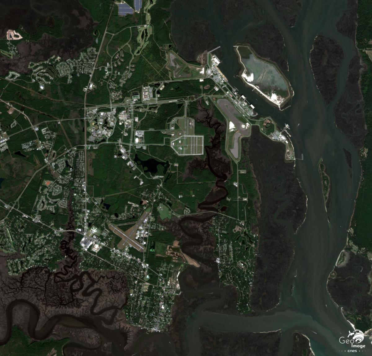 Située près de la ville de Jacsonville, en Floride, cette image génerale présente la base de la marine américaine de Kings Bay. Elle a été prise par le satellite Sentinel-2B le 10 novembre 2019. Il s’agit d’une image en couleurs naturelles de résolution native à 10m.