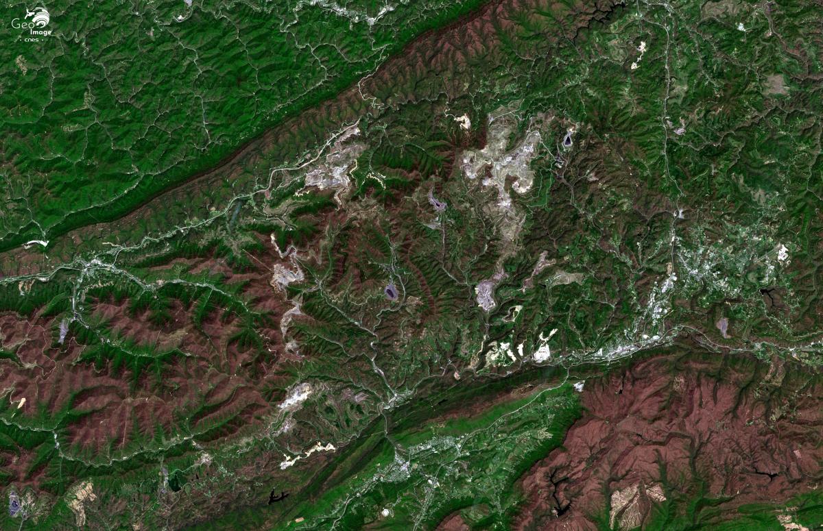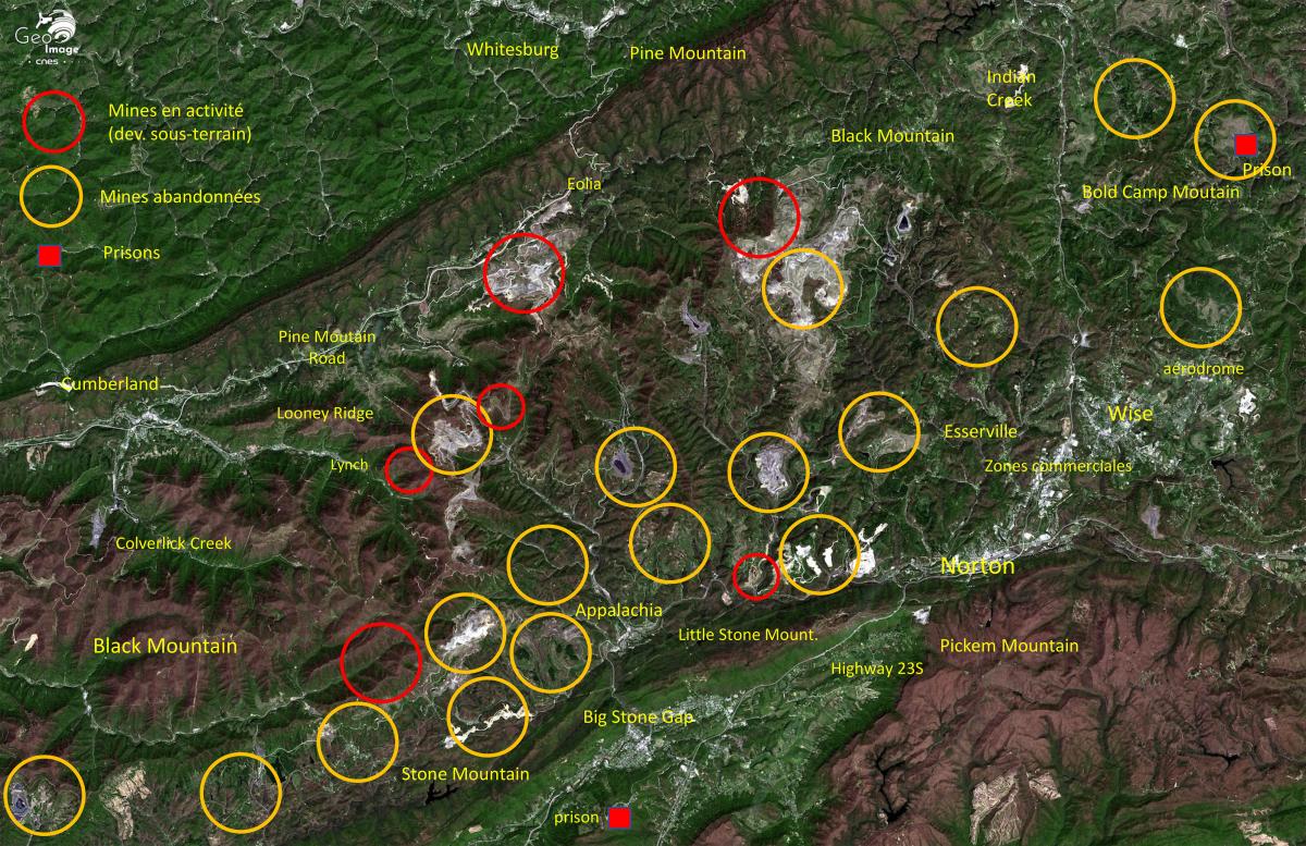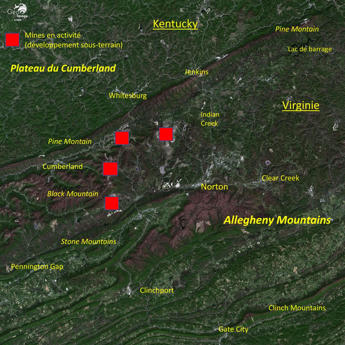 L’image laisse apparaitre au sud de la Pine Mountain une série de tâches grises, occupant parfois une superficie considérable : ce sont de grandes mines de charbon encore en activité. A l’échelle des Appalaches, nous nous trouvons dans le massif du centre à cheval sur le Kentucky, la Virginie et la Virginie occidentale. A l’échelle de l’État de Virginie, nous nous trouvons dans le bassin charbonnier du Southwest Coalfield, dont les dépôts datent de 299 à 323 millions d’années, et qui couvre les quatre comtés qui bordent la crête avec le Kentucky : Lee, Wise, sur lequel est centrée l’image, Dickenson et Buchanan.