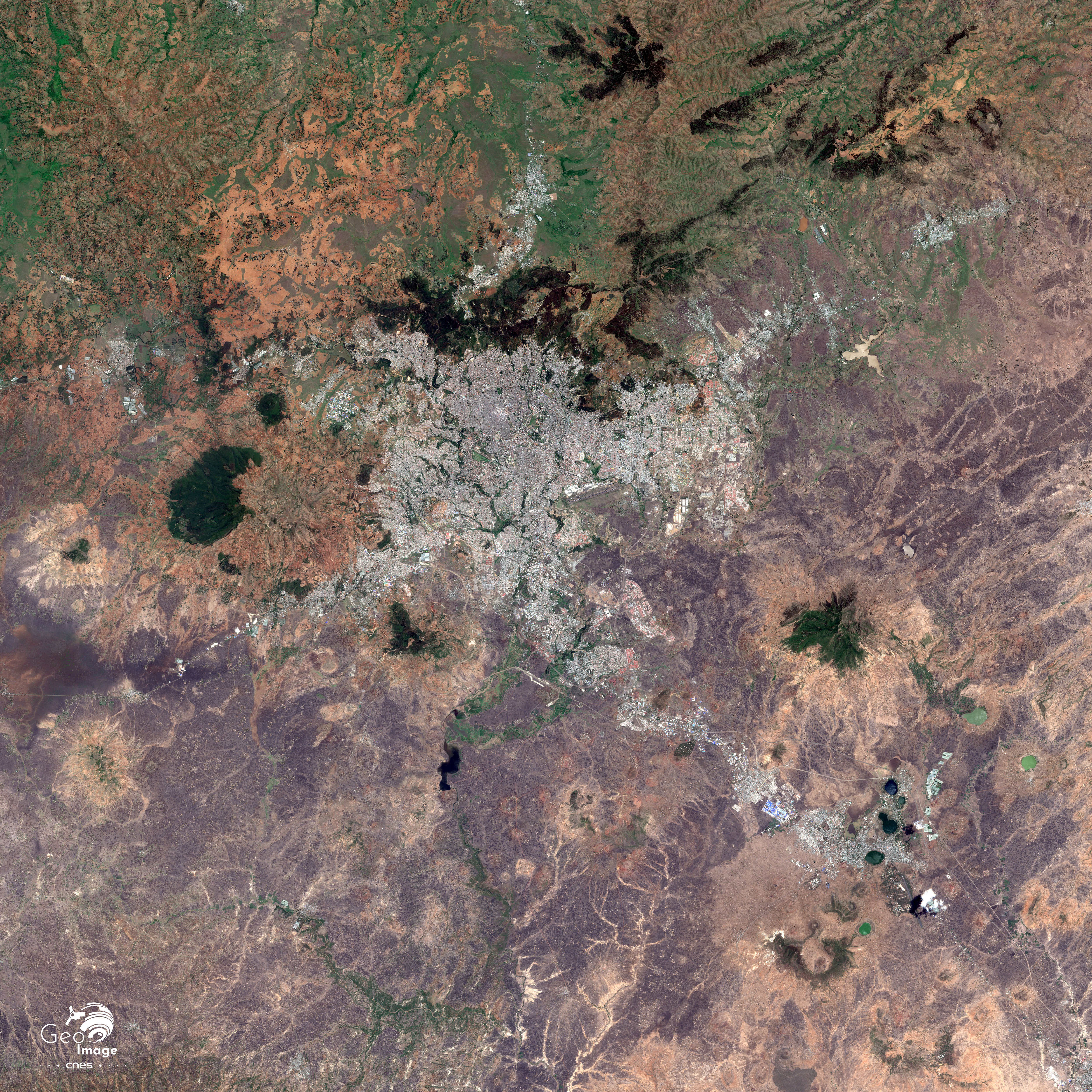 L’agglomération d’Addis Abeba dans son cadre régional des hautes terres bordant la vallée du Grand Rift (image en couleurs naturelles, de résolution native à 10 m prise par le satellite Sentinel-2B).