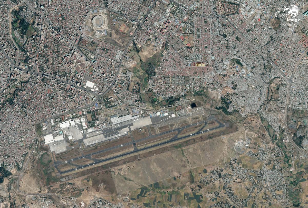 Situé au sud-est de la ville, le district de Bole couvre 122 km2 et est peuplé de 330 000 habi-tants. Sur l’image il est structuré par l’aéroport international qui se trouve à 2334 m. d’altitude. Principal hub de la compagnie Ethiopian Airlines, c’est l’un des grands pôles aéroportuaires du continent africain. Ouvert en 1962 au détriment de celui de Lidetta dont les pistes s’avéraient trop courtes, il a connu une succession d’agrandissements (nouveaux terminaux, tout de con-trôle, parkings...) en 1997, 2003, 2012 et 2019. En 2006, un nouveau terminal pour les avions de fret aérien est ouvert en lien avec l’ouverture du pays et son insertion croissance dans la mondialisation (cf. exportations de fleurs coupées...).
