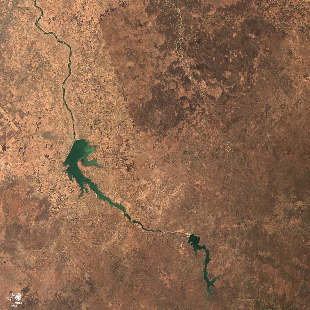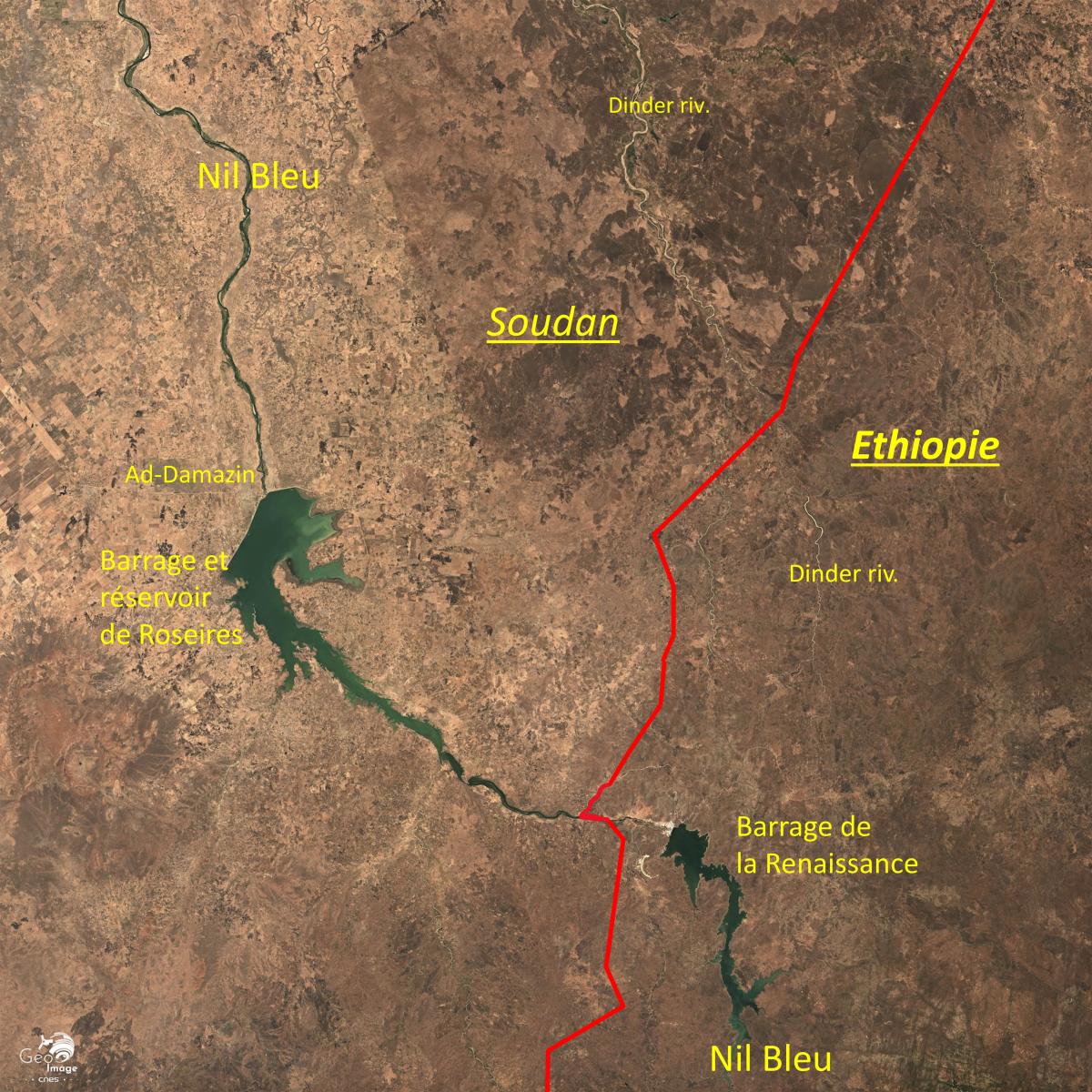 Cette vue replace le Barrage de la Renaissance dans son échelle régionale. On distingue très bien le barrage de Roseires sur le Nil Bleu à l’aval de la frontière. Au total, les barrages de Roseires et de Sennar jouent un rôle considérable en produisant 80 % de l’électricité du Soudan, en régulant les crues et en favorisant l’irrigation de la plaine de Gezira.