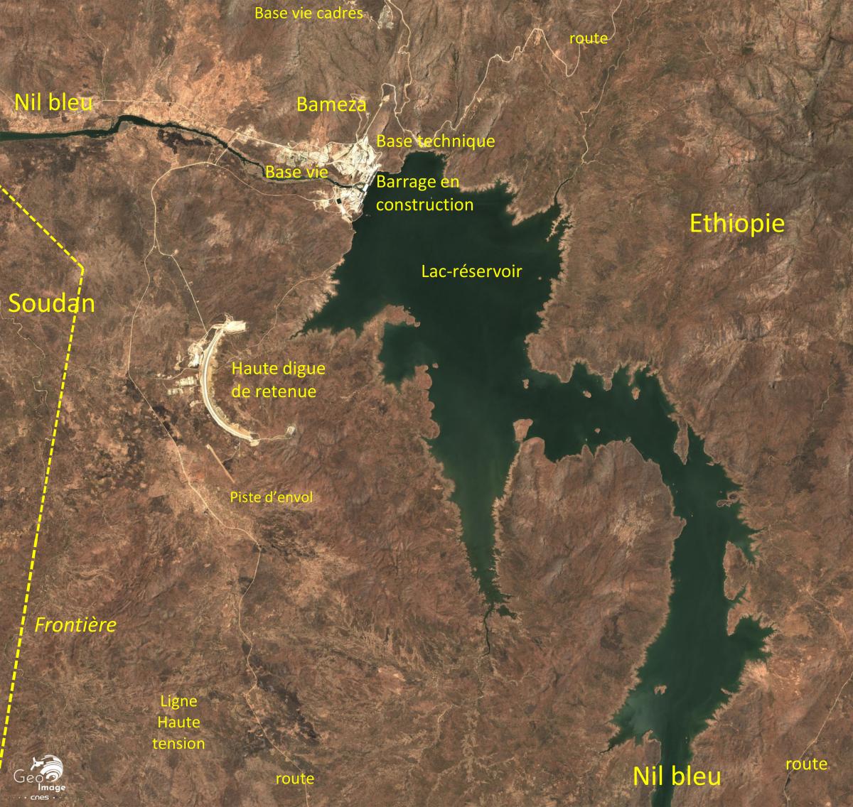 L’image couvre un barrage hydroélectrique en voie de finalisation : c’est le Grand Ethiopian Renaissance Dam - Gerd, en anglais, ou « Grand Barrage de la Renaissance ». On en repère bien les installations, la base technique (cimenterie, équipement...), la base-vie des ouvriers en bas proche des chantiers et la base-vie des cadres située plus en hauteur à l’abri du bruit et de la poussière, les routes d’accès et de circulation, la haute digue de retenue circulaire à l’ouest, les lignes à haute tension qui partent vers le sud, et - bien sur - le lac-réservoir de retenue dont l’eau va alimenter les turbines des centrales électriques...