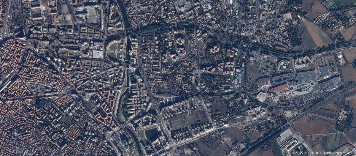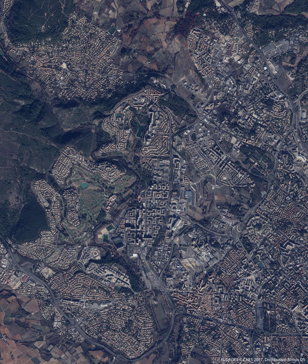 Imagen de Montpellier, ciudad del sur de Francia ubicada en el arco mediterráneo, entre Barcelona y Marsella. Esta imagen fue sacada el 15 de agosto de 2018 por un satélite Sentinel-2. Es una imagen en colores naturales, cuya resolución es de 20m.