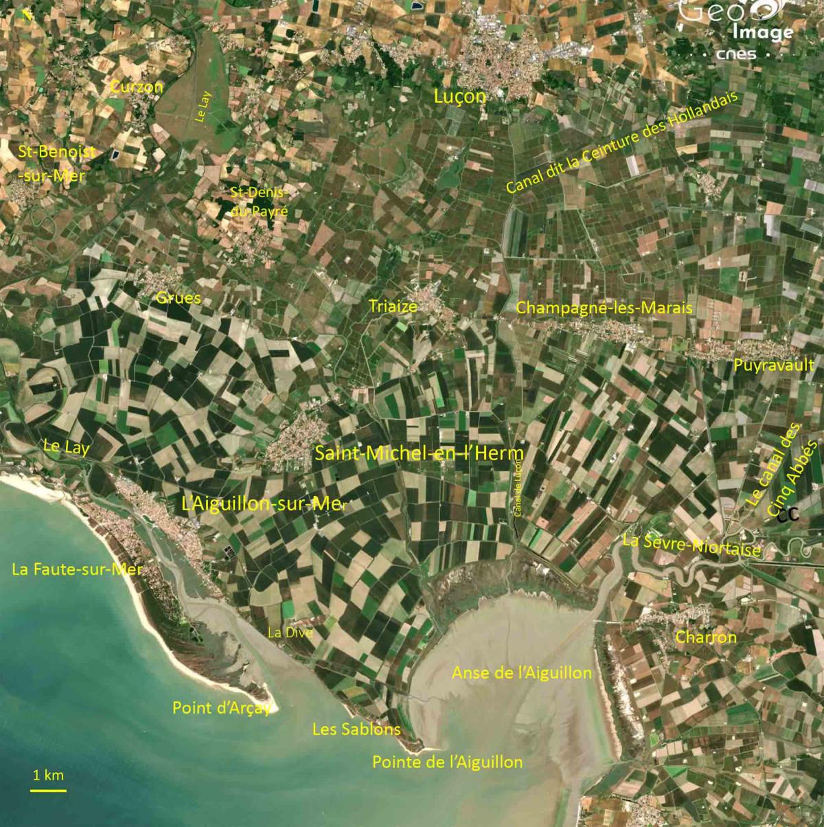 Un marais poldérisé. Les terres ont en effet été gagnées sur l’estran, en particulier sur le schorre, partie supérieure des étendues intertidales de la vasière de l’anse de l’Aiguillon, lors de différentes phases d’aménagement identifiables sur l’image.