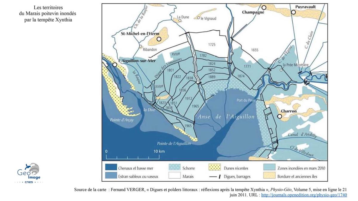 Une vaste inondation. Dans la nuit du 27 au 28 février 2010, une partie des communes de La Faute-sur-Mer et de L’Aiguillon-sur-Mer ainsi que la majeure partie des terres agricoles autour de l’anse de l’Aiguillon ont été submergées par les inondations consécutives à la tempête Xynthia. Comme le montre le document 10, les zones inondées s’étendent jusqu’aux polders conquis depuis la fin du XVIIIe siècle. Les digues de protection marines sont submergées et partiellement détruites par des brèches d’eau (doc. 11). Comme le rappelle Fernand Verger, « l’altitude des prises est en général plus faible immédiatement à l’intérieur de chaque digue qu’à l’extérieur où la sédimentation a pu se poursuivre plus longtemps » (F. Vergez, Zones humides du littoral français, 2009, Belin, p.259). La hauteur des digues n’a donc pas empêché les submersions.