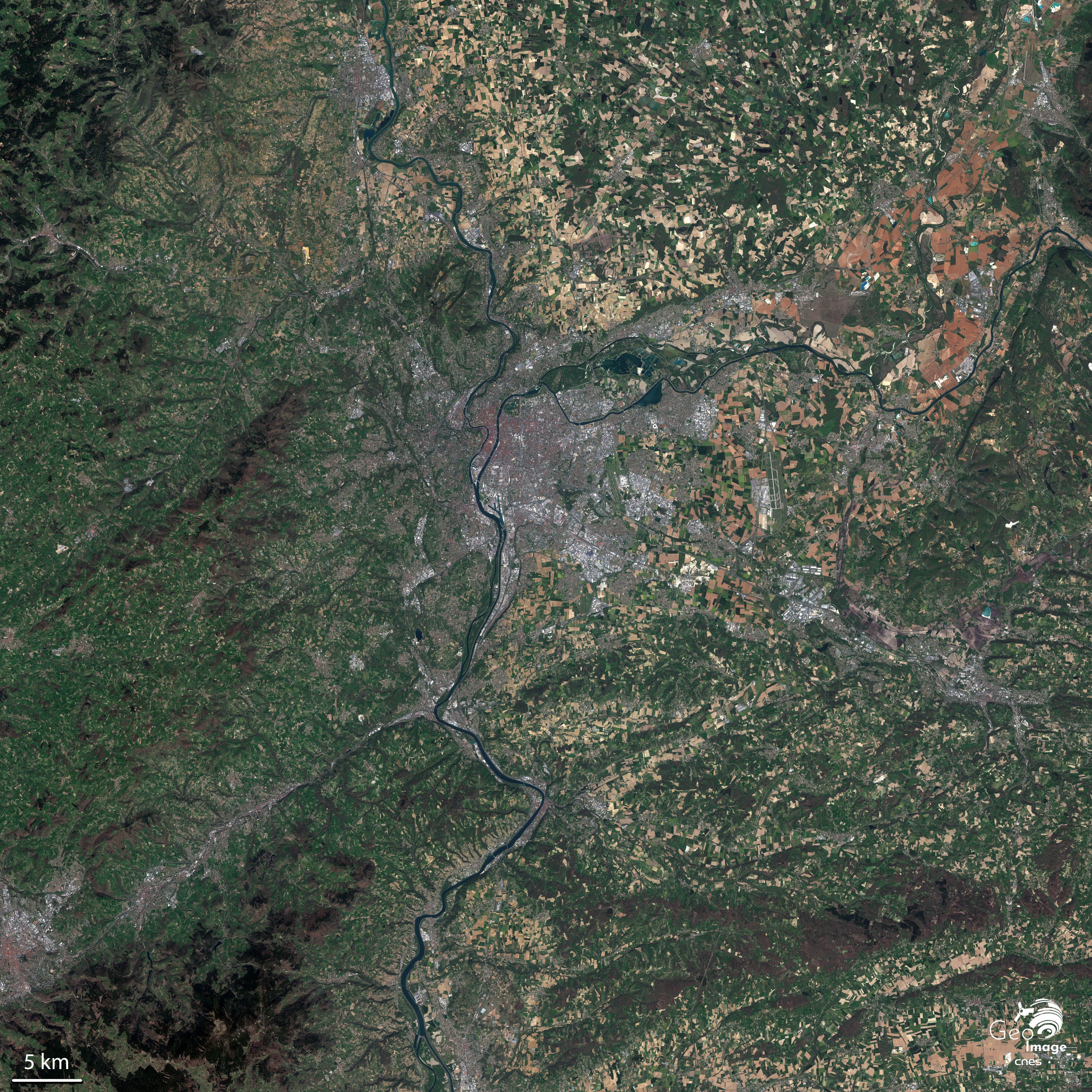 Cette image de la région de Lyon a été prise par le satellite Sentinel-2A le 7 avril 2020. Il s’agit d’une image en couleurs naturelles de résolution native à 10m.