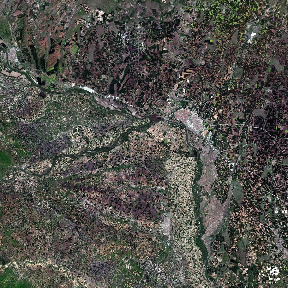 Au nord de l’image, l’Evros coule selon une orientation nord-ouest / sud-est car il vient du cœur historique de la Bulgarie – la Roumélie orientale – qui est comprise entre la chaîne des Rhodopes au sud, qui barre l’accès à la Méditerranée, et celle des Grands Balkans au nord, qui le sépare de la vallée du Danube. Au milieu de l’image, on distingue bien une tâche claire : c’est la ville d’Edirne/Andrinople, la capitale historique de la Thrace qui se trouve aujourd’hui en Turquie.