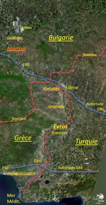 Le poste frontière de Kastanies, du nom du village grec de 600 habitants, est régulièrement fermé. Car il est le théâtre d'incidents violents entre forces policières turques et grecques et des milliers de migrants qui se sentent piégés. Les médias y viennent souvent en reportage ; tout comme certaines ONG. Mais comme le montre bien l’image, il serait possible d’y freiner, voir d’y interdire, l’arrivée des migrants en contrôlant tout simplement du côté turc les trois ponts sur le fleuve. En fait, une fois entrés dans le triangle de Kastanies les migrants se retrouvent pris dans une sore de souricière, entre fleuve et grillages/barbelés, entre intérêts turcs et grecs.