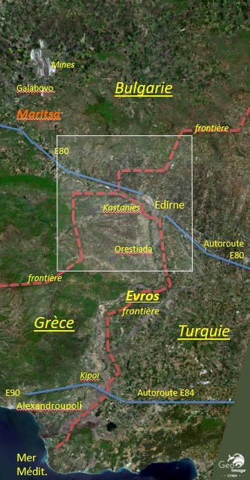 La Turquie a donc obtenu que la frontière soit déplacée sur la rive droite de l’Evros et soit fixée pour des raisons de sécurité à environ 5 km à vol d’oiseau du vieux noyau historique d’Edirne. On repère très bien à l’œil nu le tracé frontalier rectiligne de cette « enclave » turque en rive droite, souligné en particulier par la différence de parcellaire et de cultures : face à l’émiettement grec des parcelles agricoles répondent les longues parcelles rectangulaires vert foncé du côté turc.