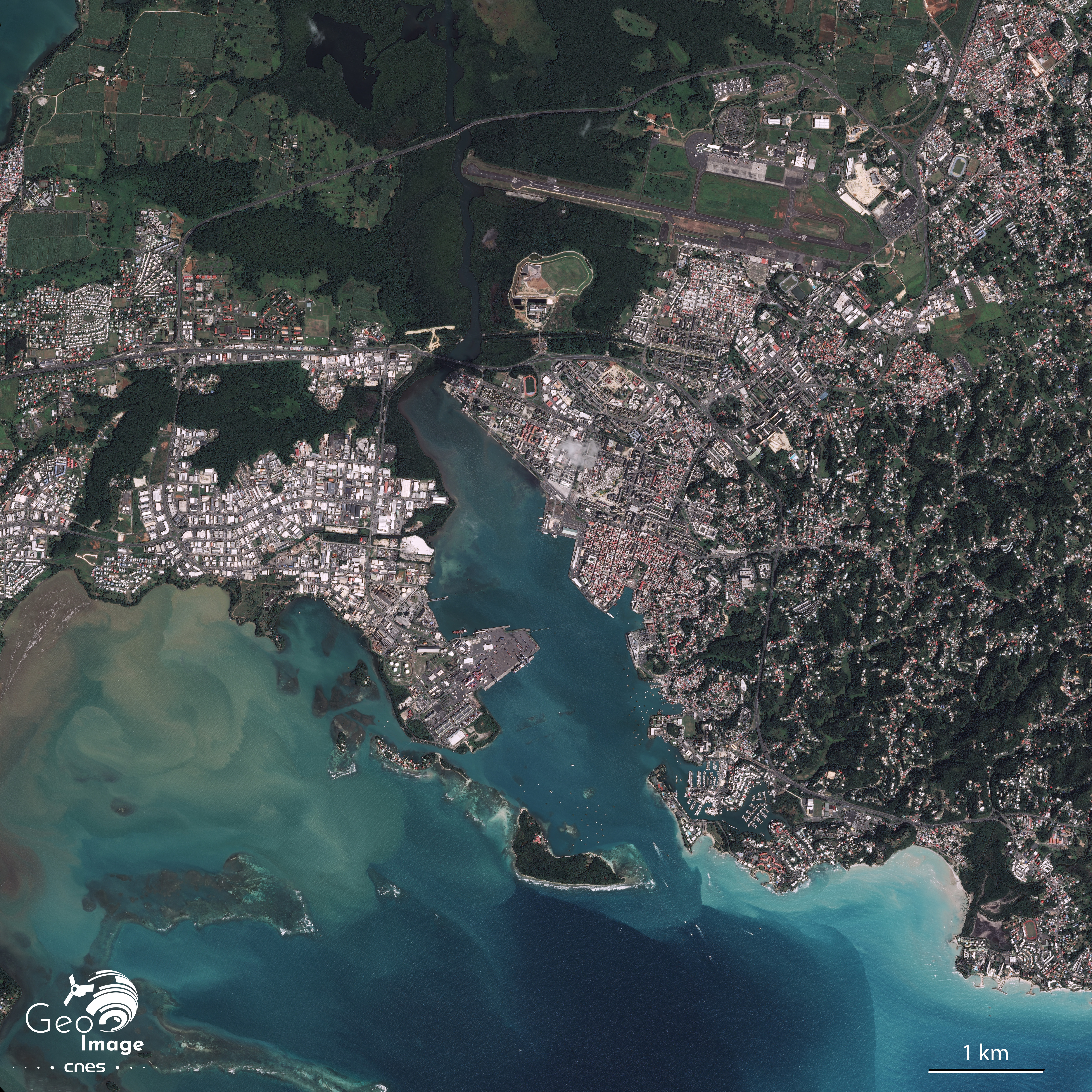 Un satellite Pleiades capture cette image de l'île de Grande-Terre, en Guadeloupe, le 30 janvier 2017. C'est la ville de Pointe-à-Pitre qui apparait au centre de l'image.