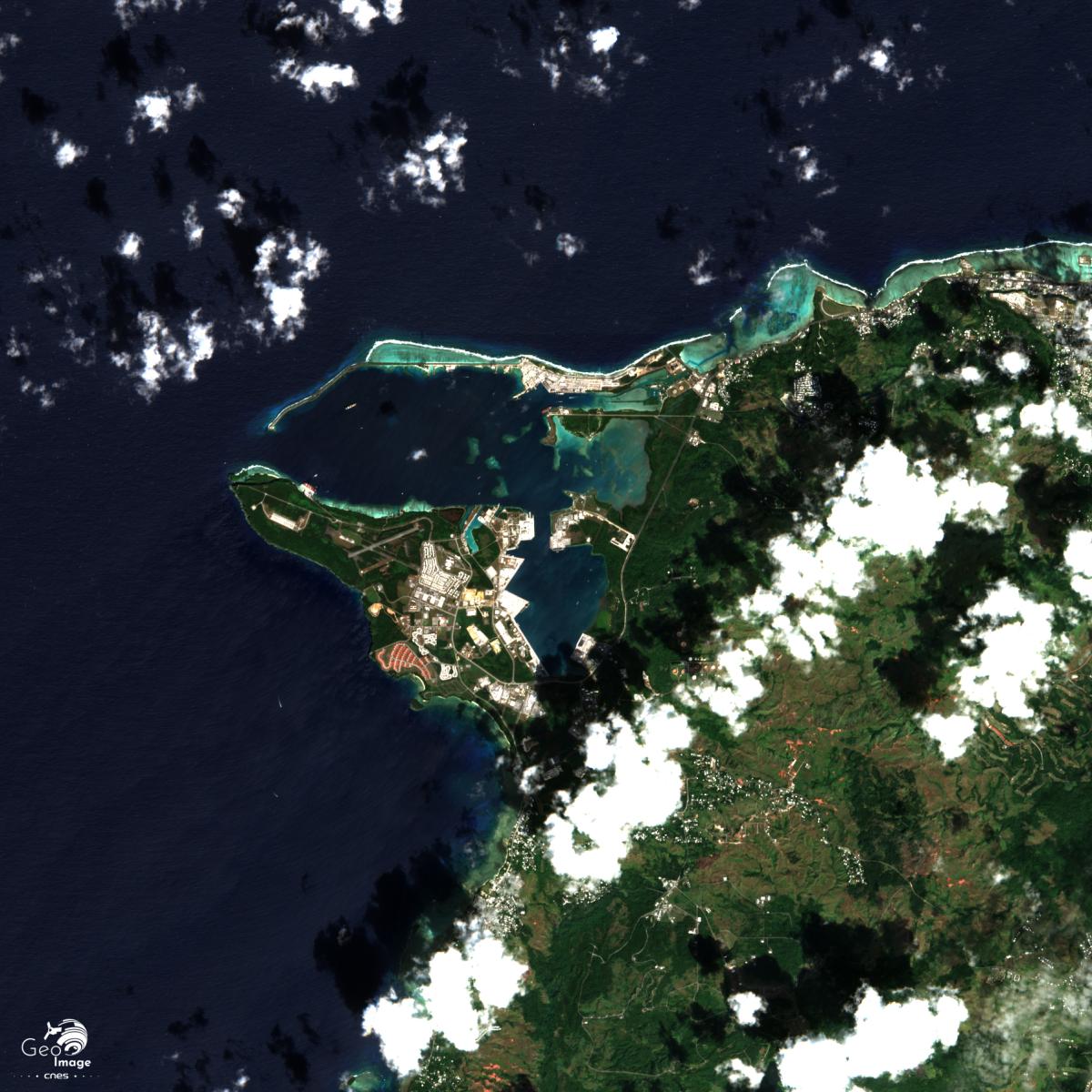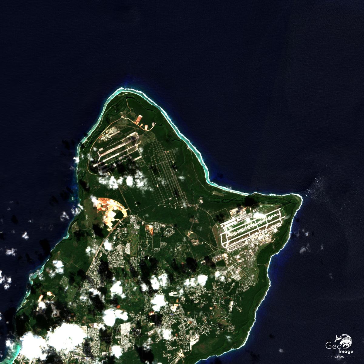 Cette image de l'île de Guam par un satellite Sentinel-2. Il s’agit d’une image mosaique (27 décembre 2019 / 20 février 2020) en couleurs naturelles avec une résolution native à 10m.