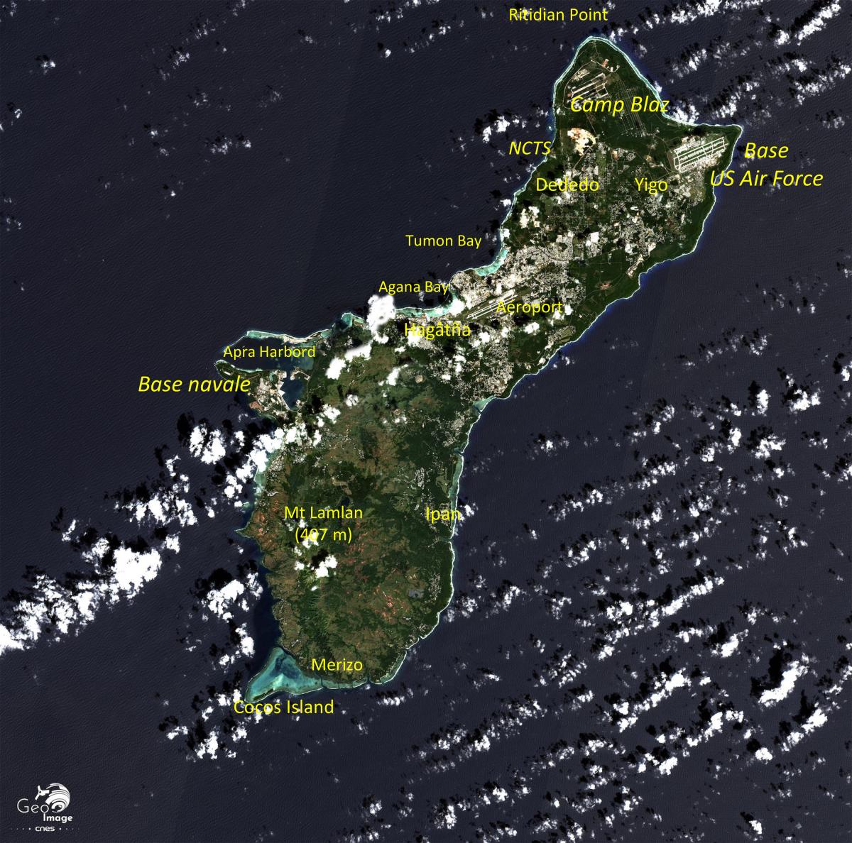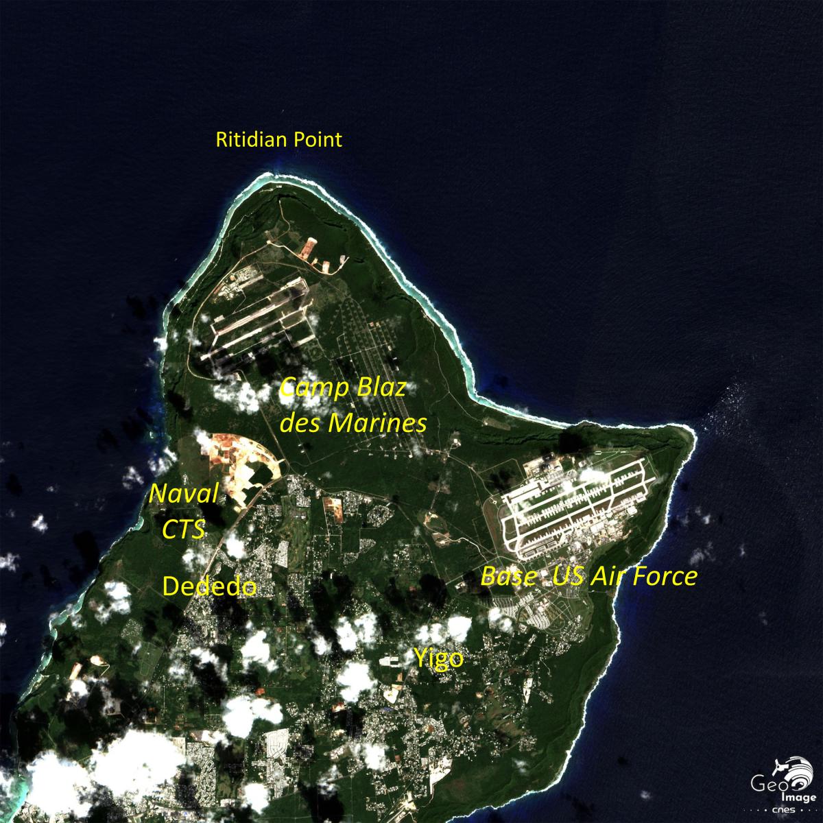 Sur l’image, la présence militaire est localement significative sur la partie septentrionale, centrale et littorale tournée vers l’est du fait des vastes espaces plans disponibles. Les communes de Yigo (base aérienne Andersen) et Dededo (camps des Marines) au nord, Agaga et Barigada au centre et Piti et Santa Rita l’ouest (base navale) sont les plus concernées. Enfin, la petite ile inhabitée de Farallon de Medinilla, située à 296 km au nord de Guam et à 83 km au nord de Saipan est utilisée comme aire d’entrainement par les bombardiers stationnés à Guam.