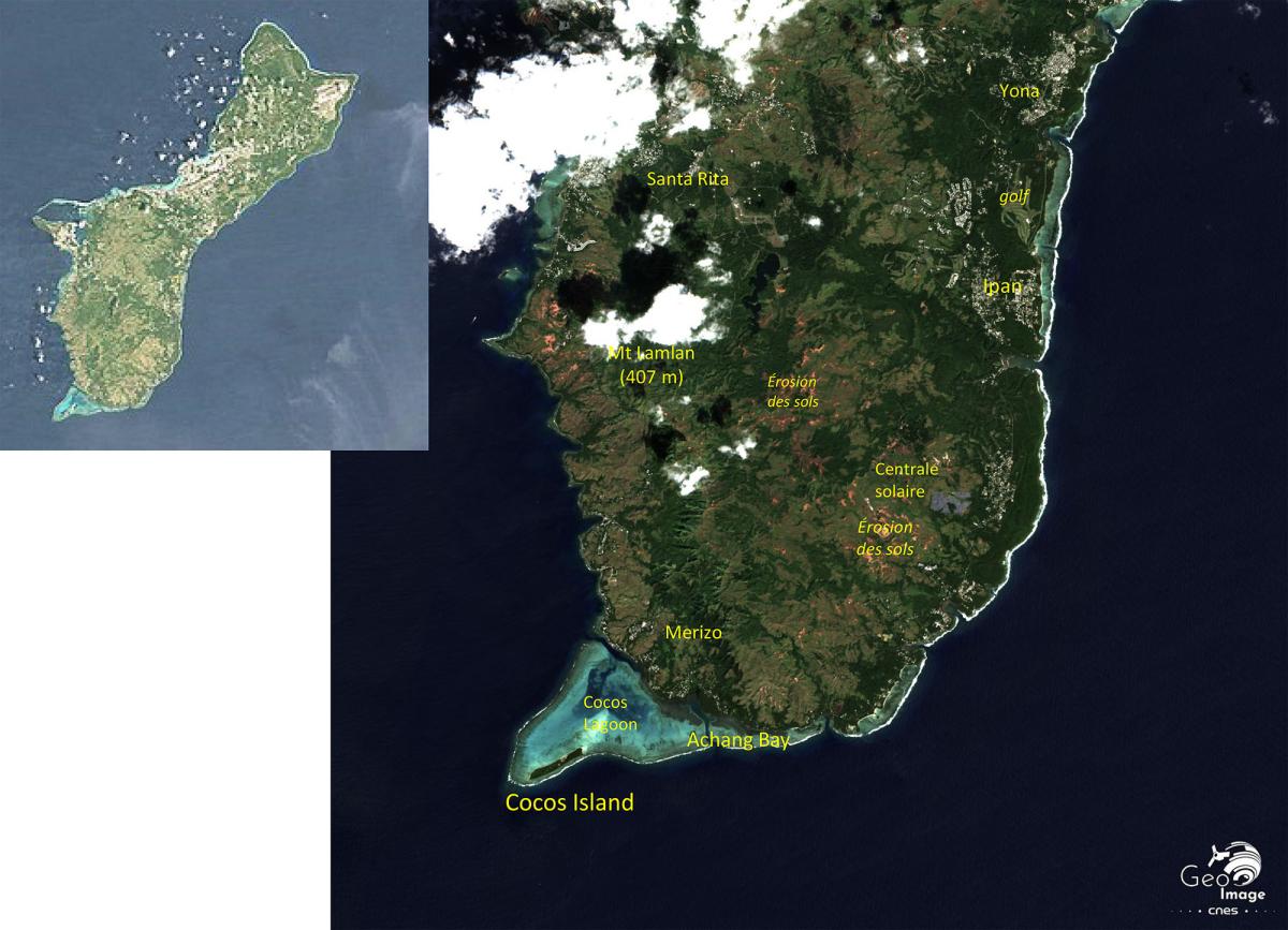 L’image couvre l’île de Guam, qui est longue et assez étroite. Elle est de petite taille puisqu’elle ne couvre que 549 km² et s’étend du nord au sud sur seulement 51 km et d’ouest en est de 6 km, dans sa partie la plus étroite, à 19 km au sud. L’importance des barrières coralliennes sur le littoral s’explique par son caractère tropical.