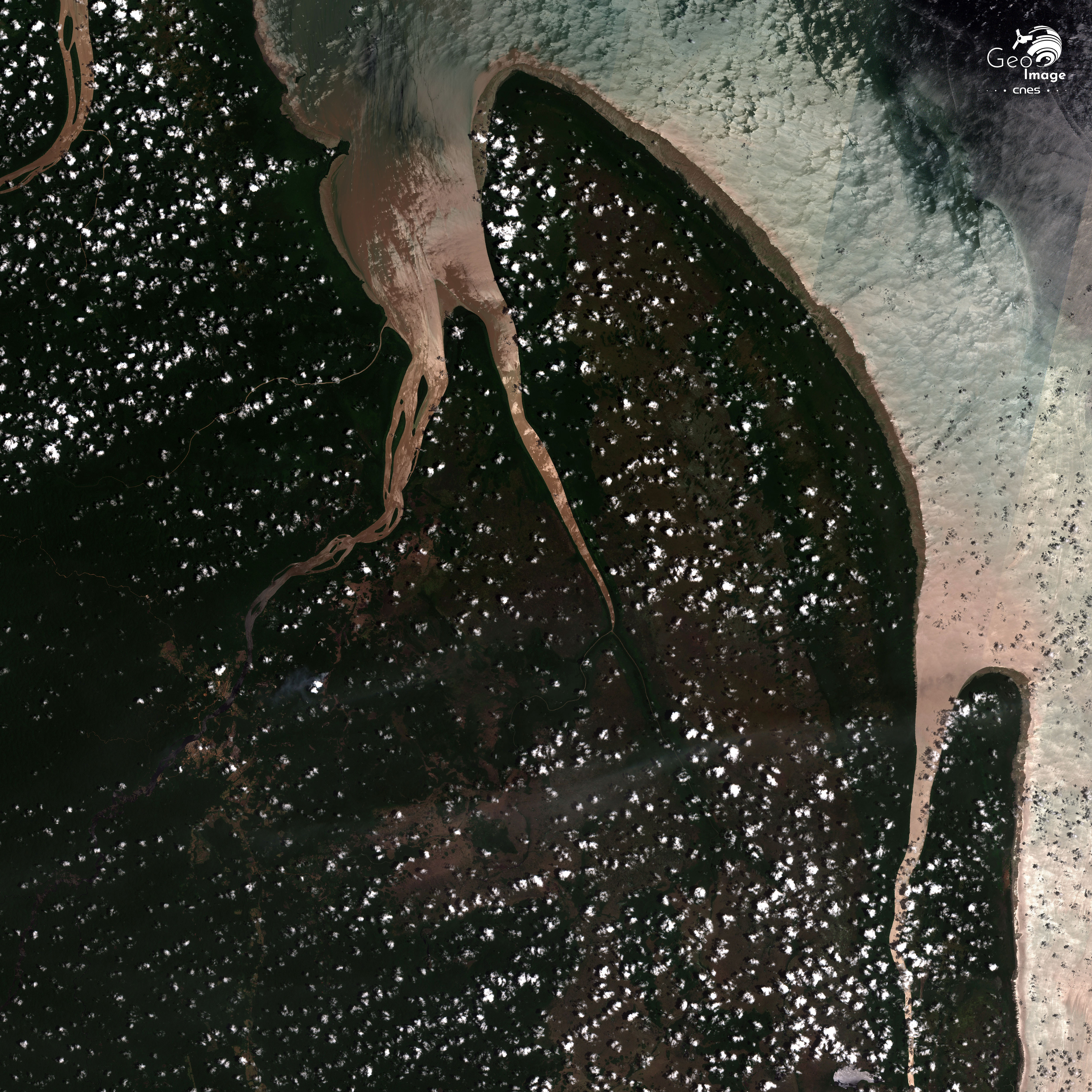 On observe, sur l’image, la très forte turbidité des eaux des fleuves de la région en raison des grandes quantités d’alluvions et de débris végétaux transportés. Elle se prolonge dans la mer où elle décroit au fur et à mesure qu’on s’éloigne du littoral.