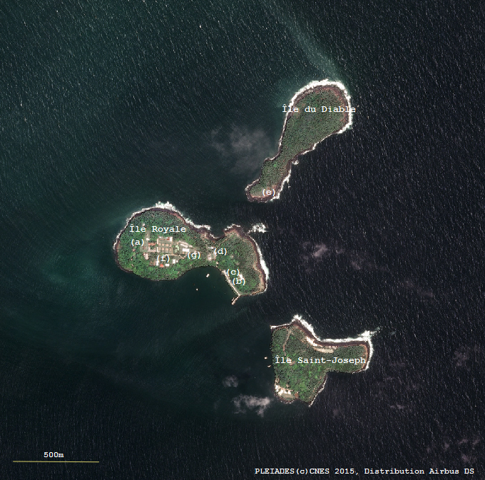 Comme le montre l’image, l’esplanade située devant la maison de Dreyfus (repère e) a été dégagée afin que l’on puisse, depuis Royale, apercevoir le lieu de détention du célèbre capitaine. Cette demeure fait partie des monuments historiques classés de l’archipel, aux côtés de l’ancien hôpital et de la chapelle (repère f) sur l’île Royale ; toute restauration doit donc être validée par la Direction des affaires culturelles (DAC).