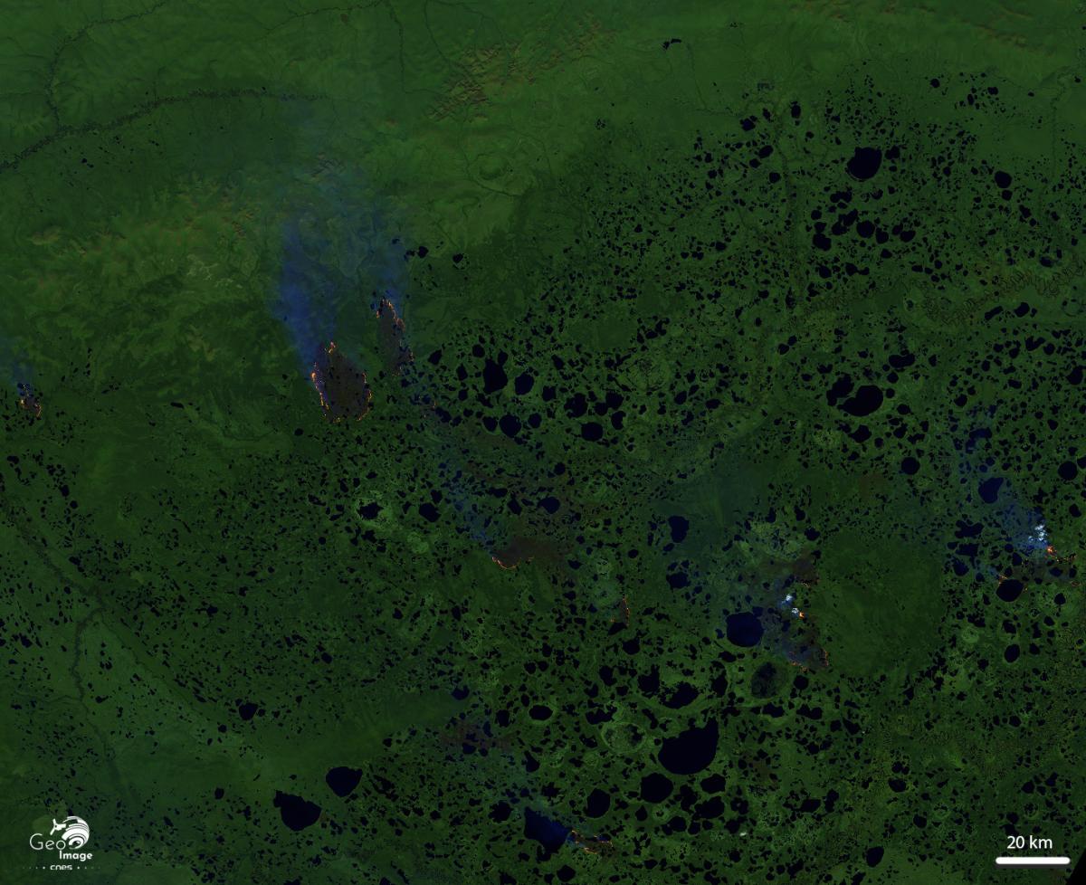 L'image satellite a été prise le 20 juin 2020 par un satellite Sentinel-2 au Nord de la République de Sakha près du cercle polaire arctique. Elle couvre une distance de près de 200 km d'ouest en est dans les plaines de Lakoutie parcourues plus à l'ouest par le cours inférieur du fleuve. Cette image dite en fausse couleur, utilise des bandes spectrales (des parties du spectre lumineux) dans l’infrarouge et le rouge. Ainsi la végétation apparait dans des tons de vert, l’eau la neige et la glace en noir. Ces bandes spectrales sont utilisées ici pour mettre en évidence les incendies : des flammes dans les tons orange et des fumées dans les tons bleus apparaissent. Ainsi on note la multiplication des incendies (près d'une dizaine de foyers) à la faveur du dégel. Leur nombre : leur intensité, leur surface (cf échelle) et leur localisation dans un espace de très faible densité (densité moyenne de la République de Sakha : 0,31 habitants au km²) interrogent sur leur origine.