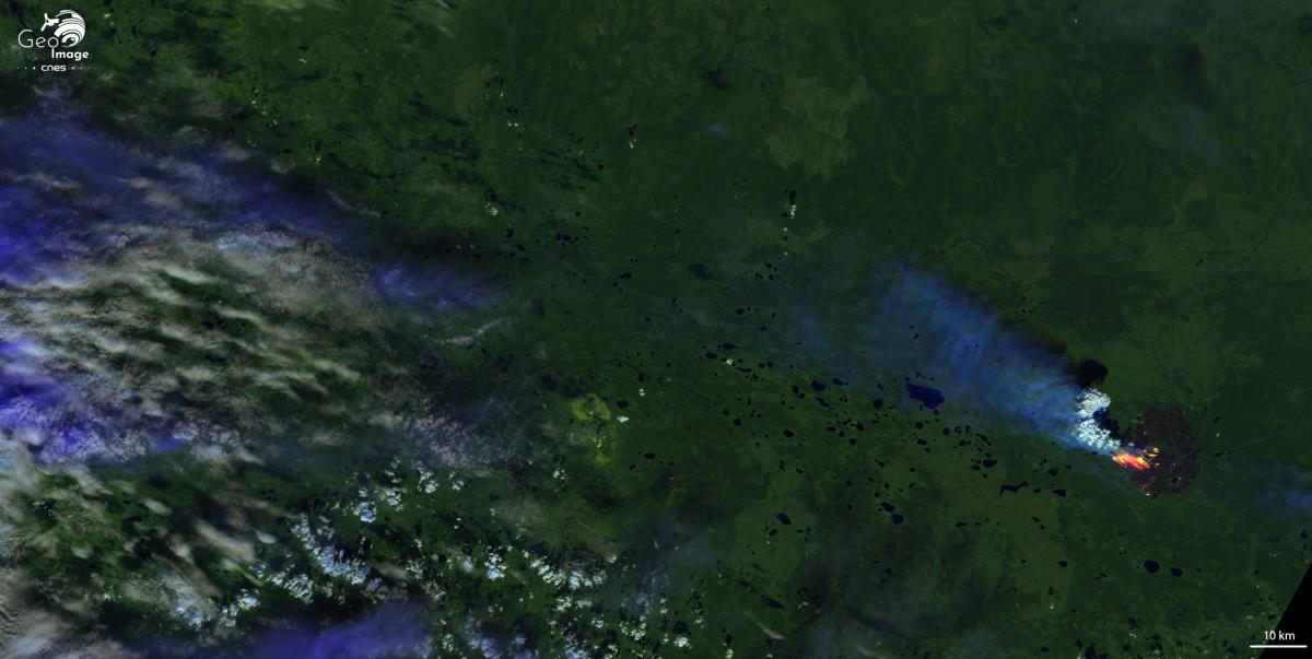 Image Sentinel-2 du 9 juillet 2020 prise en Russie à la frontière de la république de Sakha et de Krasnoiarsk. Cette image comme la première est en fausse couleur. Les nuages qui se forment au-dessus des sources de chaleur apparaissent en bleu. Ces pyrocumulonimbus bien visibles sur l'image se forment lors des incendies de grande ampleur. Ils sont caractérisés par une température élevée et une surabondance de particules fines. Les pyrocumulonimbus génèrent peu de précipitations mais peuvent provoquer des orages secs susceptibles de déclencher d'autres incendies.