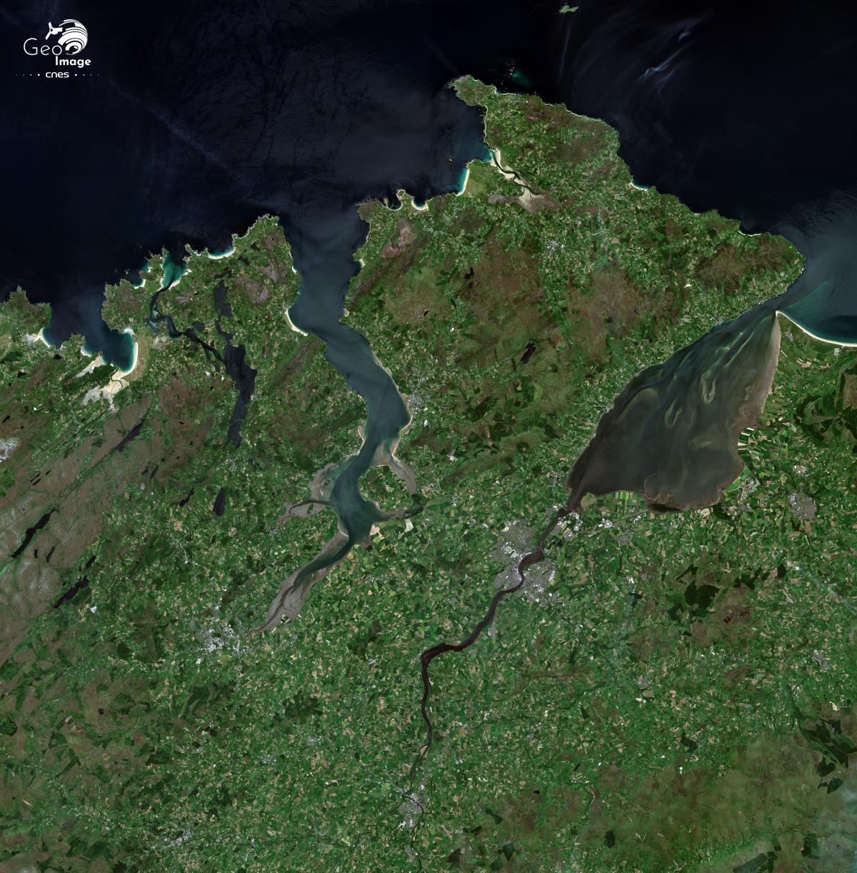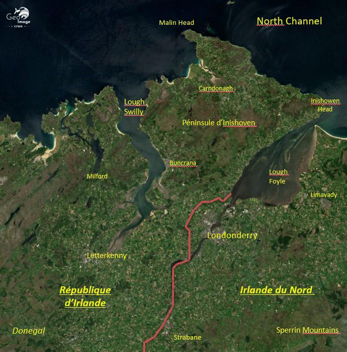 Londonderry in its regional setting: a town at the bottom of an estuary, in a sheltered position at the bottom of the bay at the limits of the border between Ireland and Northern Ireland.
