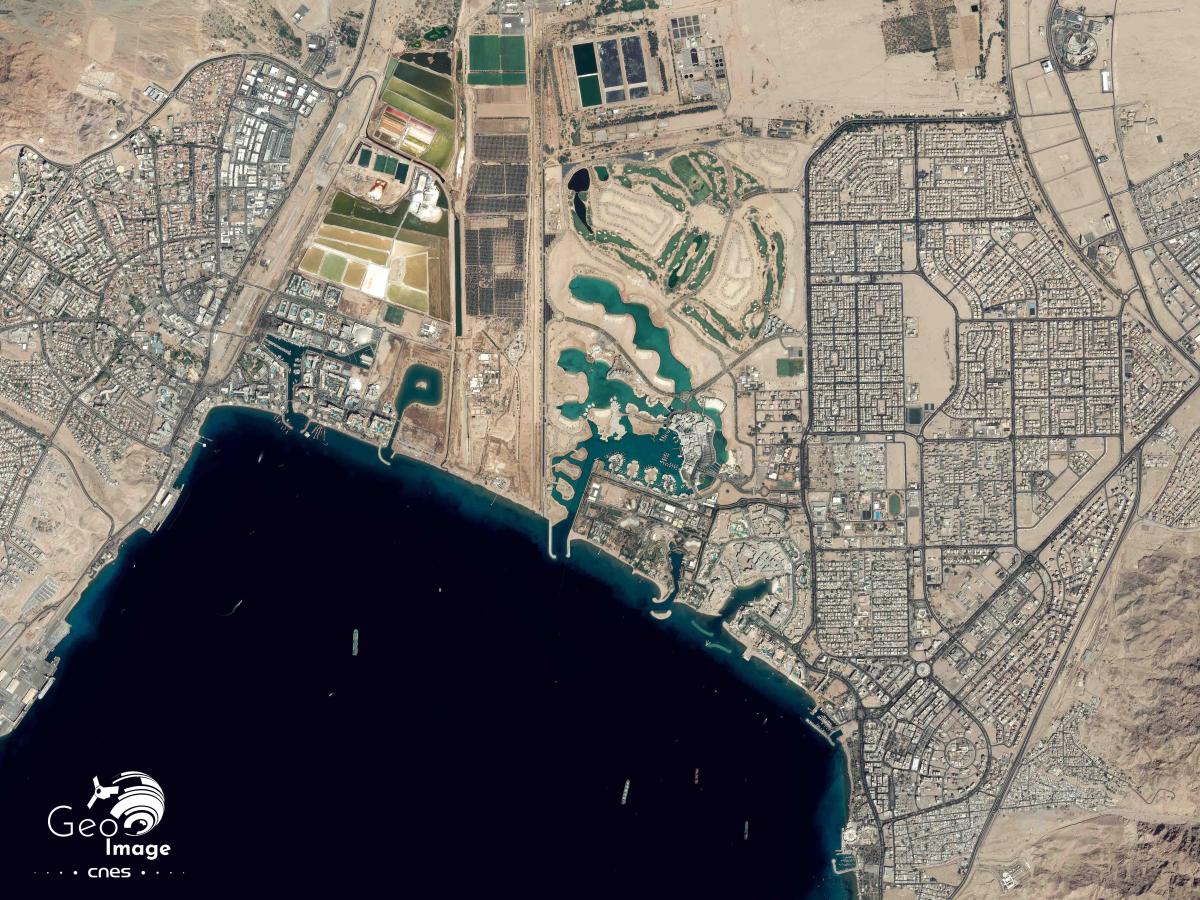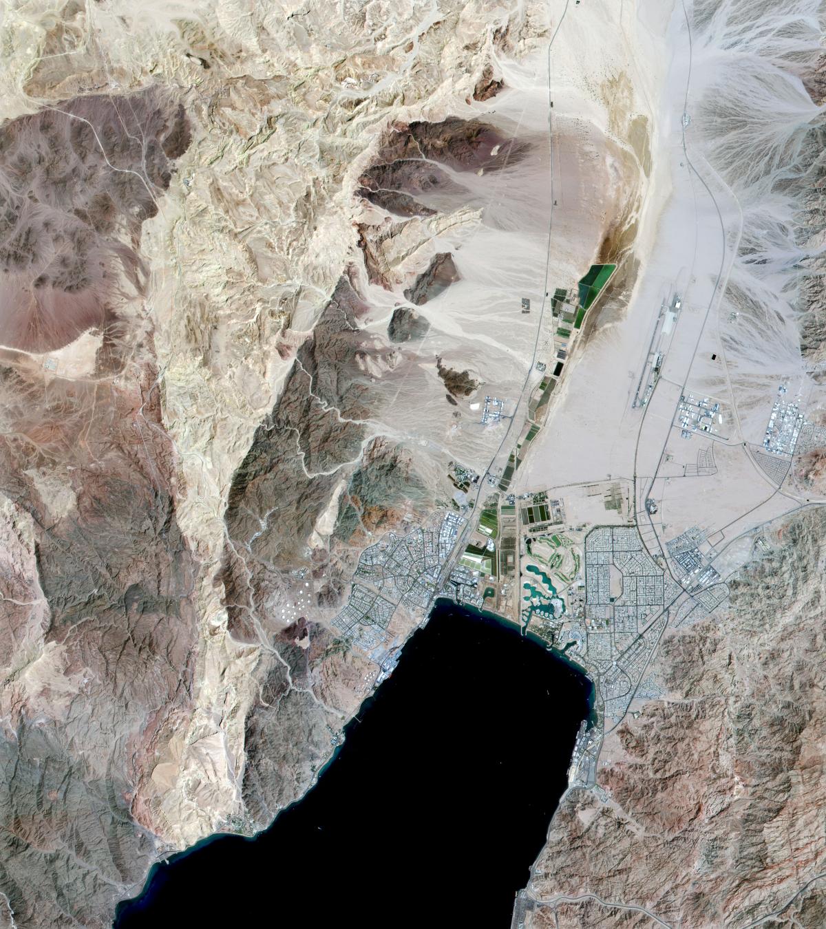 Au sud d’Aqaba enfin se déploient les installations portuaires, d’importance nationale, avec un terminal à conteneurs et plus au sud un terminal pétrolier accolé à un complexe chimique au contact immédiat du poste frontière de Durra. La station saoudienne de Haql se déplie 5 km au sud. On identifie aussi des complexes hôteliers et résidentiels récents et l’université.