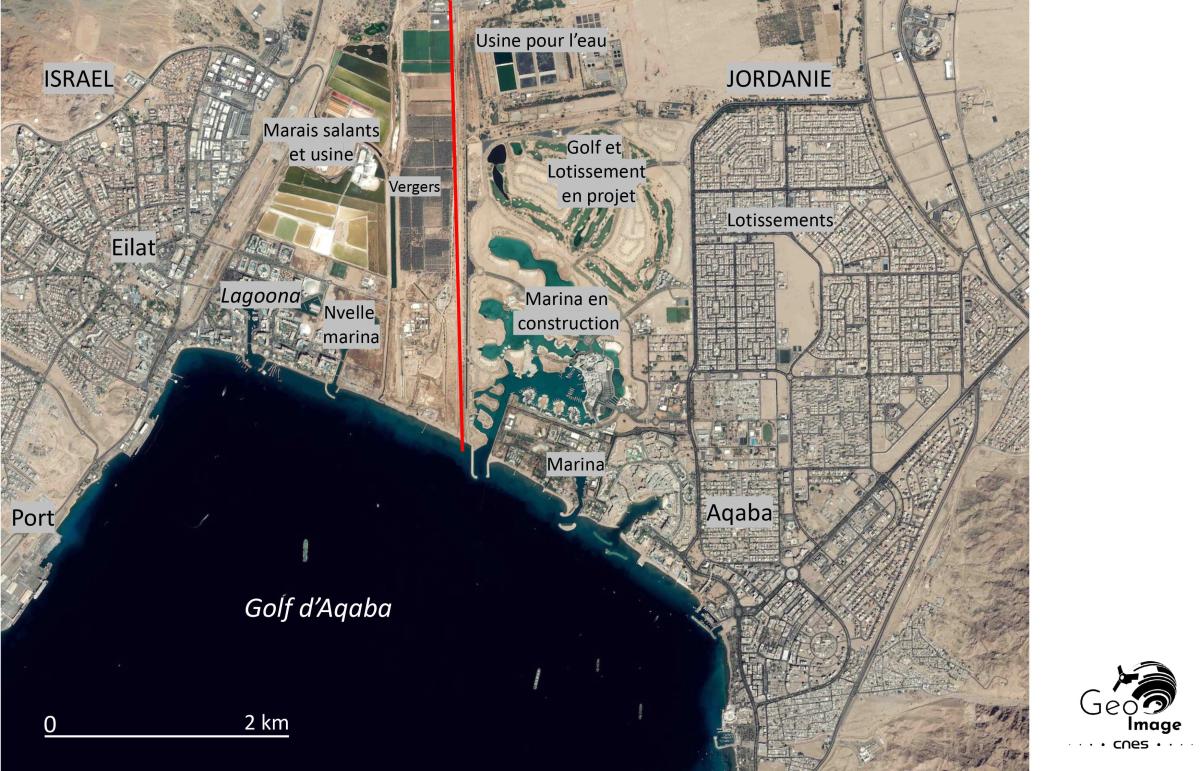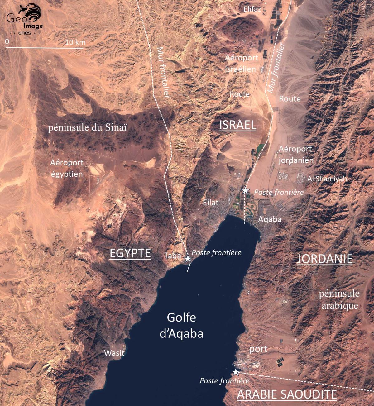 Sur l’image, c’est bien sur le doublet urbain frontalier Eilat/Aqaba qui retient l’attention. Au milieu des reliefs striés d’oueds à sec, elle témoigne de la présence du fait urbain dans un espace aride en dépit des contraintes physiques et, surtout, de la longue hostilité entre les trois pays mis ici en contact. Des guerres ont en effet opposé Israël à ses deux voisins arabes dès la proclamation de l’État hébreu en 1948. Le plan de partage de la Palestine mandataire par l’ONU prévoyait de confier à l’entité juive la partie sud et le désert du Néguev. Celle-ci attaquée, devait à tout prix conserver l’accès à la mer Rouge, bien que cette dernière demeure contrôlée plus au sud par l’Égypte et l’Arabie saoudite au détroit de Tiran qui met en contact le Golfe d’Aqaba avec la Mer rouge.