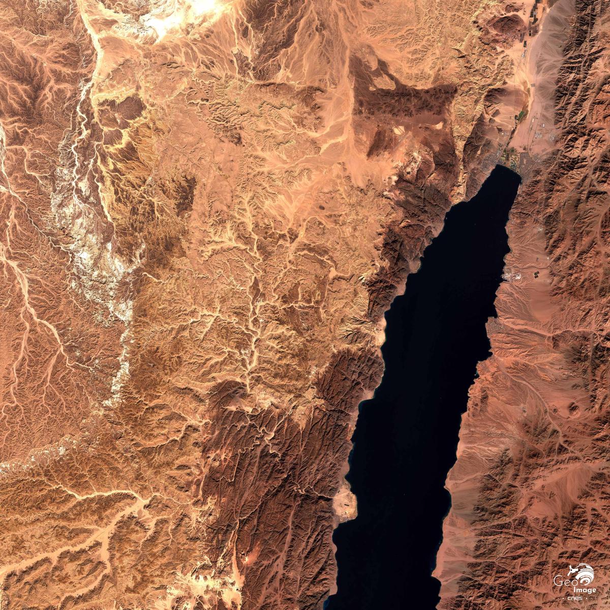 Comme le montre bien l’image générale, la région est composée de deux grands massifs de hautes terres à l’ouest et à l’est qui sont séparé en position centrale par une longue dépression topographique. Né d’un effondrement tectonique qui court depuis le Liban, ce vaste et long système de fossé - ou graben - est occupé plus au nord par le lac de Tibériade, la vallée du Jourdain et la mer Morte. Sur l’image, sa partie nord est comblée, on peut relever en particulier l’importance sur le versant est des cônes de déjection en gris ; sa partie sud par contre est occupé par les eaux marines du golfe d’Aqaba qui s’élargit progressivement vers le sud. Le golfe d’Aqaba marque la transition entre la péninsule du Sinaï à l’ouest de l’image et la péninsule arabique à l’est.