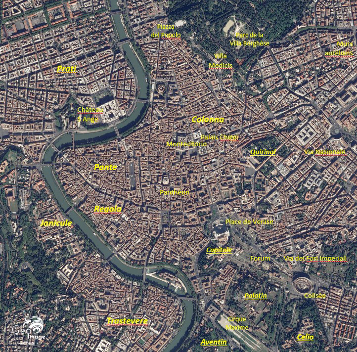 Le centre historique, que l’image embrasse du Cirque Maxime et du Colisée au Sud jusqu’à la place du Peuple et à la villa Borghese au Nord, et de la colline du Janicule à l’Ouest jusqu’au quartiers proches de la gare, créés après l’unification, recoupe le Municipio 1 (centre aurélien et quartiers nord : Prati, Flaminio…).
