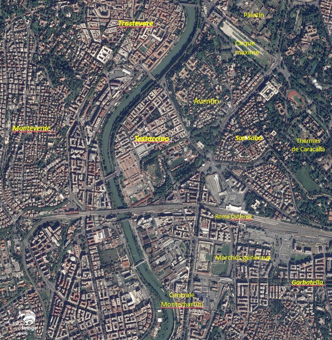 Métropole d’un Empire de 5 millions de km² puis de la Chrétienté, devenue en 1870 capitale nationale, Rome est une ville exceptionnelle autant dans l’imaginaire qu’elle suscite que dans sa réalité urbaine complexe. Ville au quotidien difficile, mais aussi « cité qui rend heureux » (C Brice, 2007) par sa beauté, palimpseste de temporalités imbriquées. C’est aussi une ville-mosaïque à la fois monumentale et désordonnée, ce dont témoigne l’image satellite qui couvre le centre historique et une partie de la « ville consolidée » au XXe siècle. Si elle n’est pas « globale » au sens économique du terme, concurrencée en cela par Milan, Rome – avec 2,8 millions d’habitants, 4,3 pour la métropole - reste d’importance mondiale par son rôle de double capitale et la place qu’elle tient dans la culture et le tourisme.