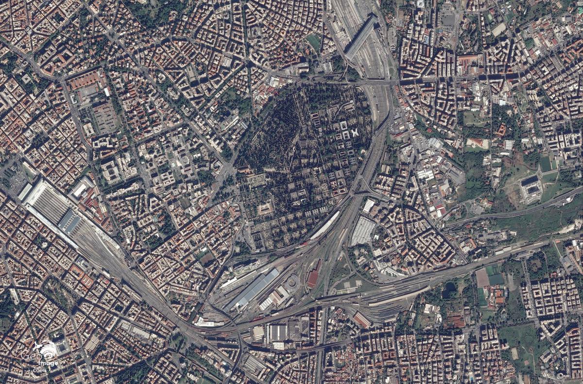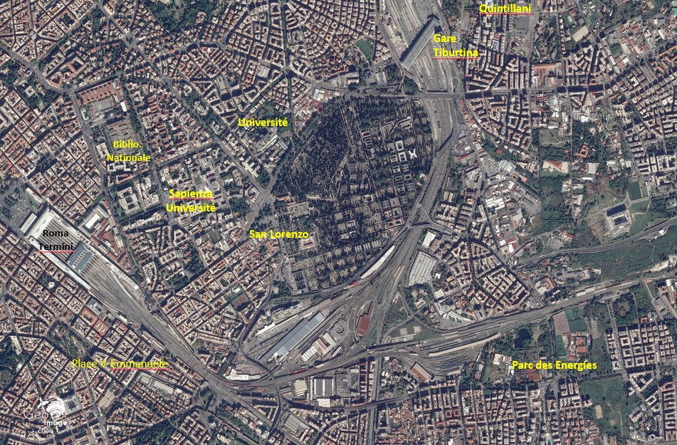 Mais ils voient aussi se développer dans les années 1980 un quartier commercial d’immigration, même si sur le plan résidentiel, la présence des immigrés est plus diffuse car elle est très liée aux emplois du care : ainsi, le municipio 1 (centre historique) devance nettement le municipio 2 visualisé ici (respectivement 22,7 % et 12,7 % de la population). Ce quartier de gare a aussi vu s’épanouir dans les dernières décennies la fonction hôtelière et les résidences touristiques. De l’autre côté de la muraille aurélienne, l’ex-quartier ouvrier de San Lorenzo est gentrifié. Ce à quoi a contribué la proximité de services métropolitains comme l’Université La Sapienza, la plus grande université italienne, l’hôpital du Policlinico et la Bibliothèque nationale de Castro Pretorio.
