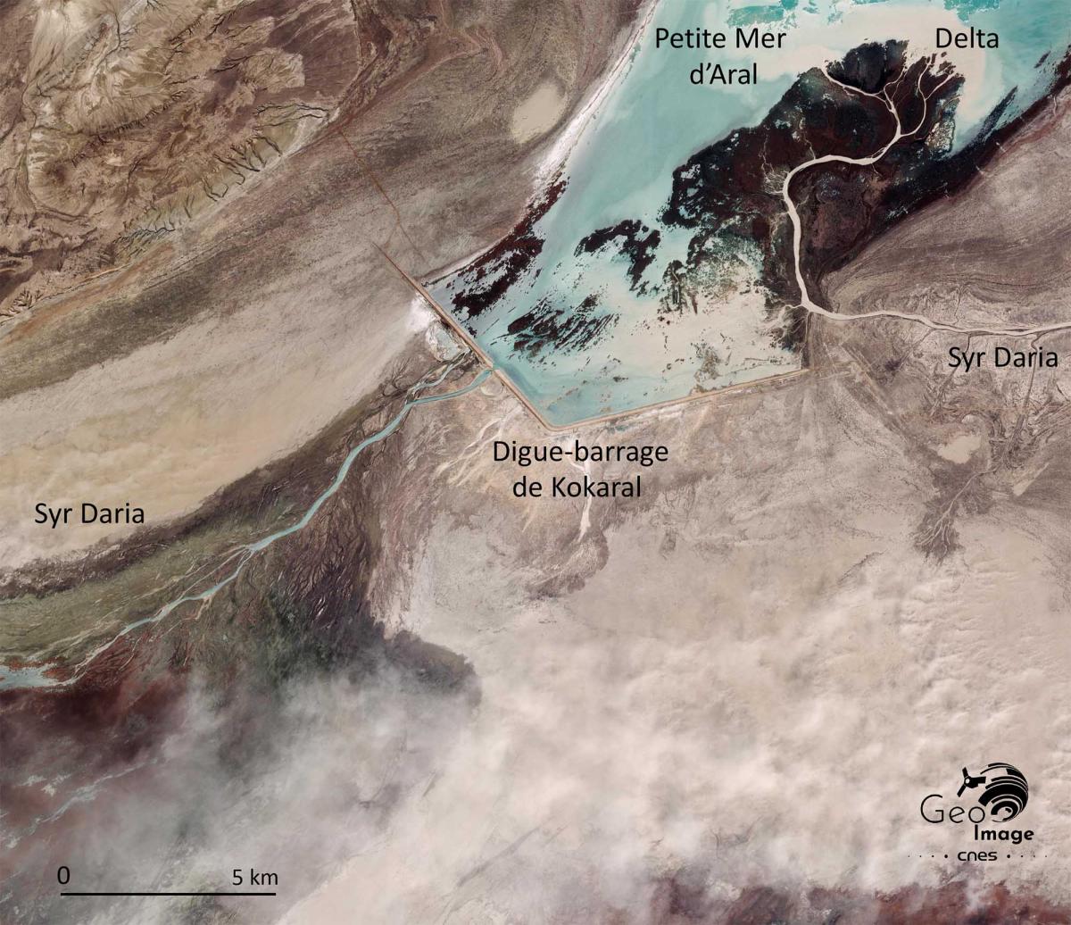 Nous sommes au Kazakhstan en pleine Asie centrale dans la très vaste cuvette aralienne. Dans un espace assez plan s’étageant entre 40 et 200 m. d’altitude, on distingue bien la Petite Mer d’Aral, d’assez faible profondeur et comprenant trois annexes – dont Butakov et Shevchenko – en train de bien s’individualiser. Celle-ci est alimentée au sud-est par l’arrivée à l’amont des eaux du Syr Daria, l’antique Jaxarte, qui avec le légendaires Oxus (Amou-Daria) participaient des axes des grandes Routes de la Soie en Asie centrale connectant de grandes cités millénaires (Samarkand, Boukhara, Khiva...).