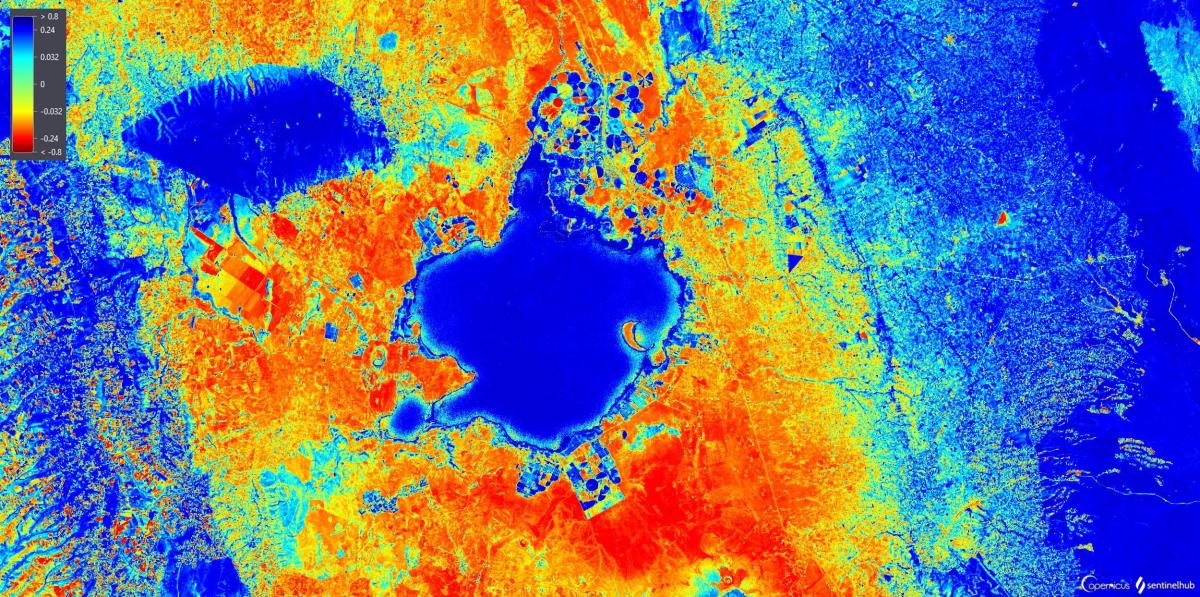 Image du satellite Sentinel-2 présentant un traitement, l'indice d'humidité par différence normalisée (NDMI). Celui-ci est utilisé pour déterminer la teneur en eau des sols et surveiller les sécheresses. Les valeurs négatives du NDMI correspondent à un sol stérile (teintes rouges). Les valeurs autour de zéro (-0,2 à 0,4) correspondent généralement à un stress hydrique. Les valeurs élevées (teintes bleues) correspondent à un couvert végétal ne présentant pas de stress hydrique (environ 0,4 à 1).