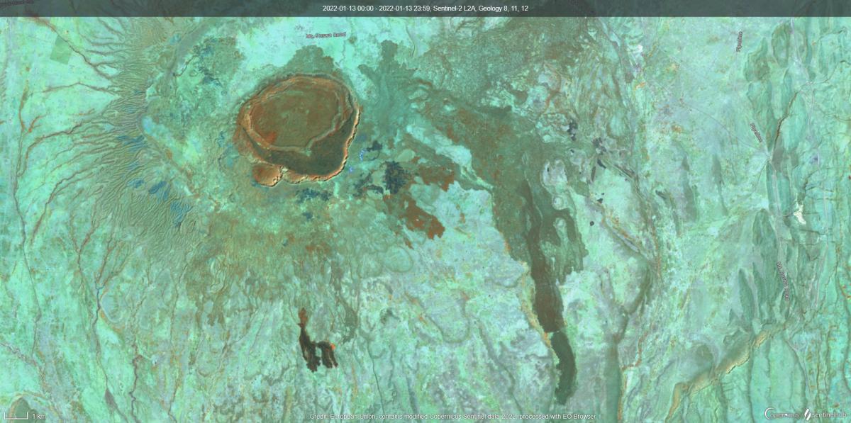 Cette image utilise les bandes spectrales 8, 11 et 12 du satellite Sentinel-2. Les bandes 11 et 12 de l'infrarouge à ondes courtes (SWIR) permettent de différencier différents types de roches . La bande 8 du proche infrarouge (NIR) met en évidence la végétation (en rouge), contribuant ainsi à différencier les éléments à la surface du sol.