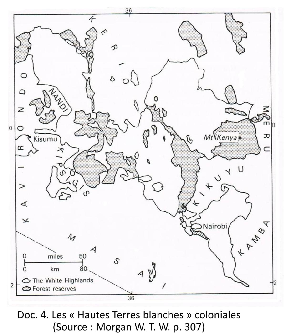 Représentant 20 % de la superficie de la colonie, ces « Hautes Terres Blanches » – situées à une altitude de plus de 1600 m., limite supérieure du paludisme avant la Première Guerre mondiale - étaient théoriquement interdites aux Africains qui ne détenaient pas de permis de travail, toujours temporaire. La population noire avait été repoussée dans des Natives Reserves.