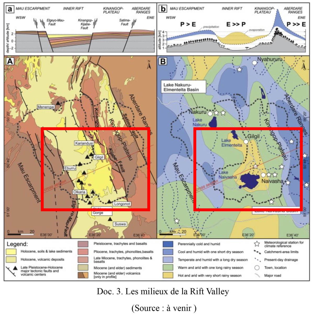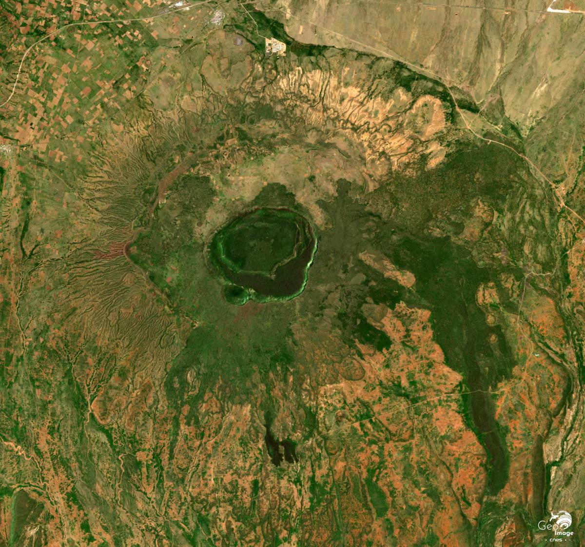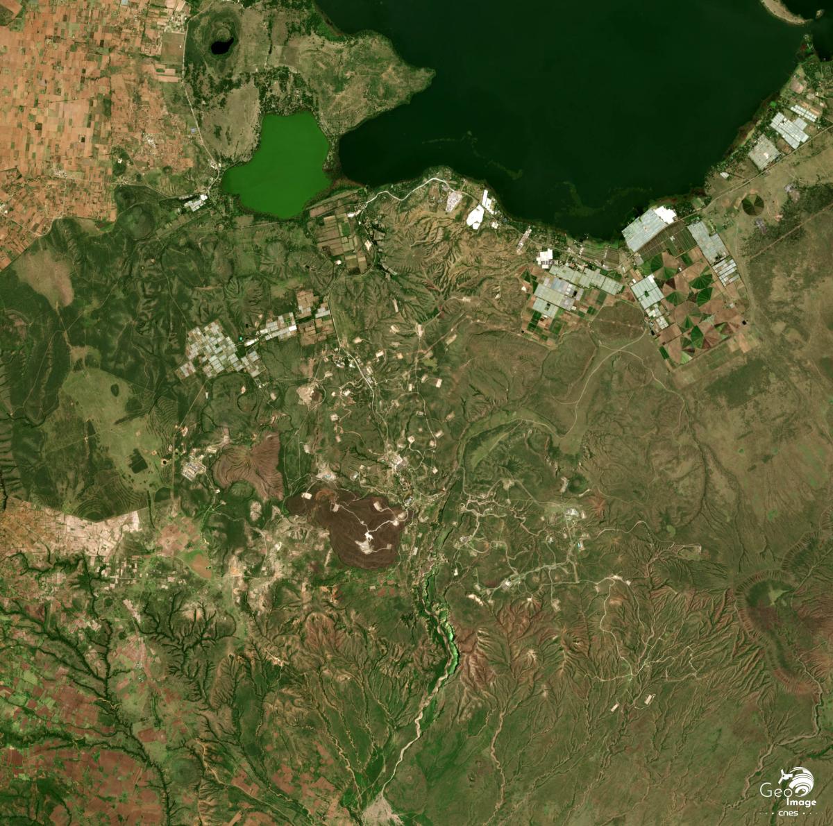 On trouve ainsi au sud le Longonot – à 3 000 m. - dont la caldeira et la coulée basaltique de la dernière éruption à partir d’un petit cône adventice sur le versant nord se voient très nettement sur l’image. Tout comme le complexe d’Ol Karia dans le parc d’Hell’s Gate (pumices volcaniques), le massif d’Eburru à 2.800 m., les petits cônes au sud du lac Eleimenteita ou les cratères acides à l’ouest du lac Naivasha. Tous sont des volcans quaternaires. Au niveau de Hells’ Gate et du massif d’Eburu, des geysers et fumerolles indiquent la proximité relative du matériel magmatique. De nombreux espaces portent la marque d’effusions volcaniques très récentes - pumices, coulées, tuffs - qui rendent les sols peu épais et parfois quasi-stériles, et de faisceaux de failles encore actives qui compartimentent l’espace.